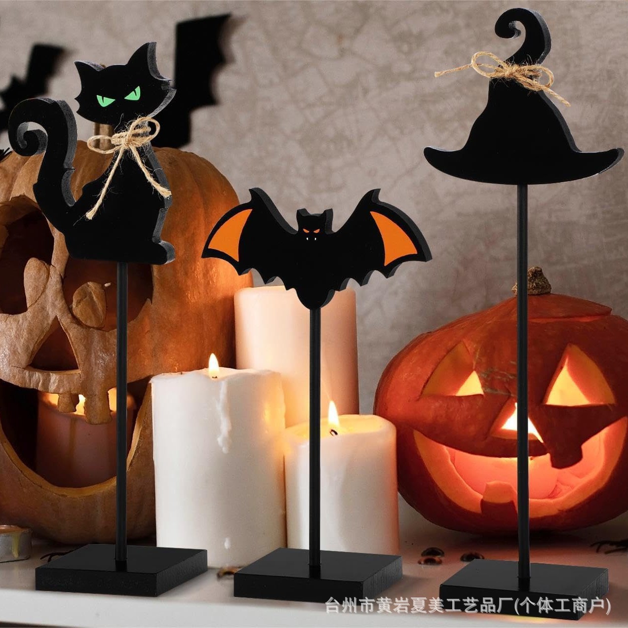 ハロウィンパーティー装飾用品緑の目黒猫コウモリ魔女帽子デスクトップセンタースタンド木製装飾装飾品