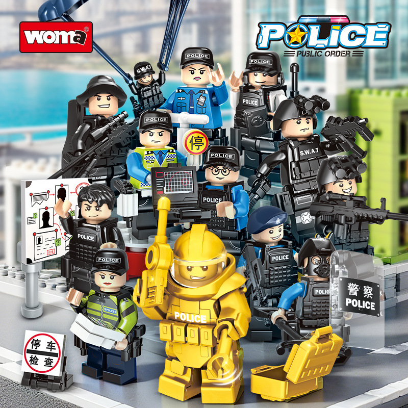 沃马积木城市警察人仔军事特种兵男孩子特警益智拼装儿童玩具礼物