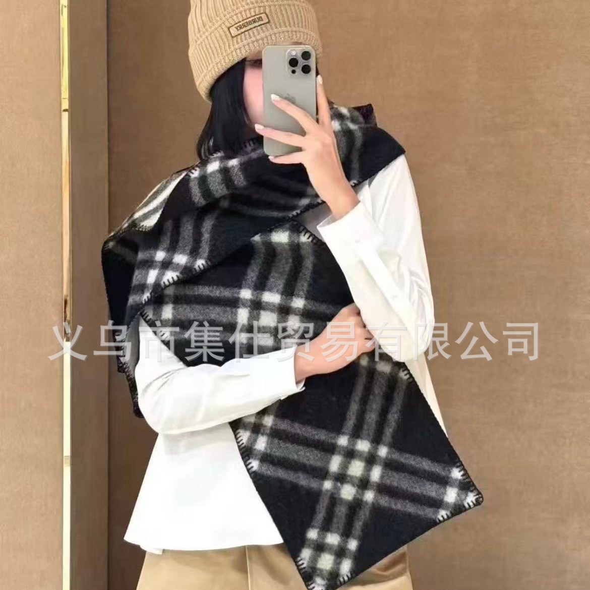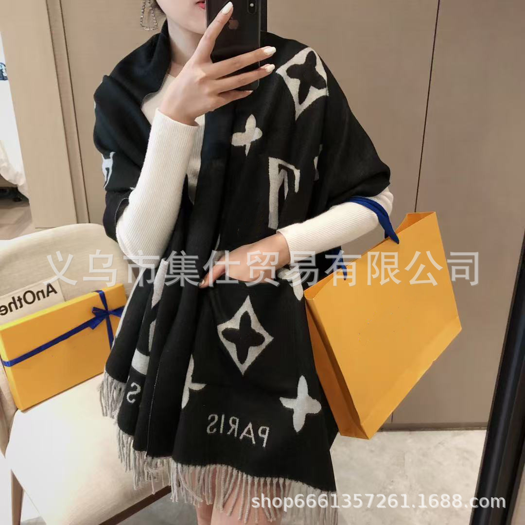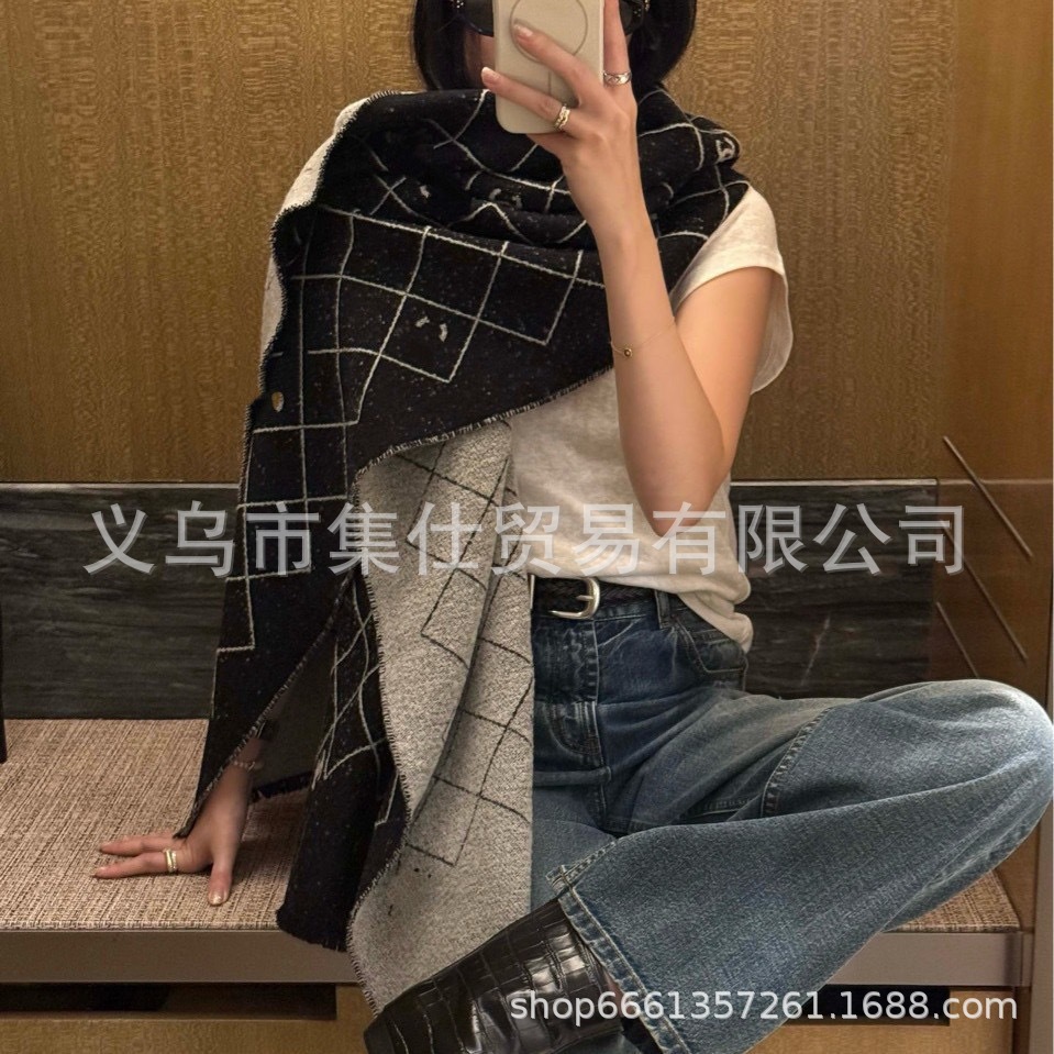 经典菱格图案与C 字母元素双面提花黑灰配色高级羊绒围巾女披肩