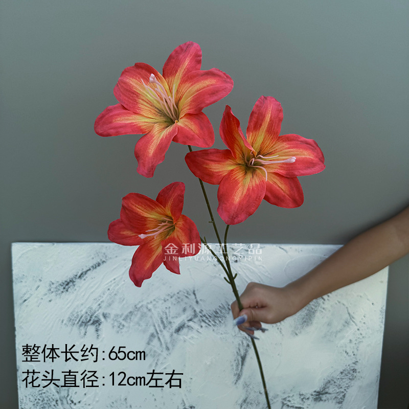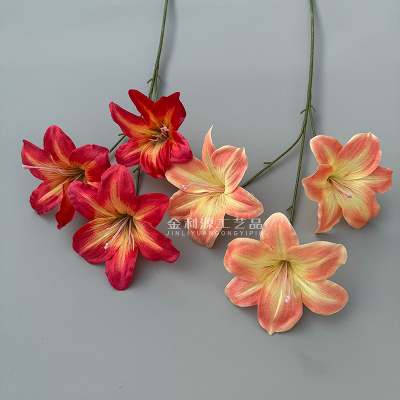 婚庆仿真花 绢布打印色3头百合 婚庆酒店布置花艺装饰厂家批发