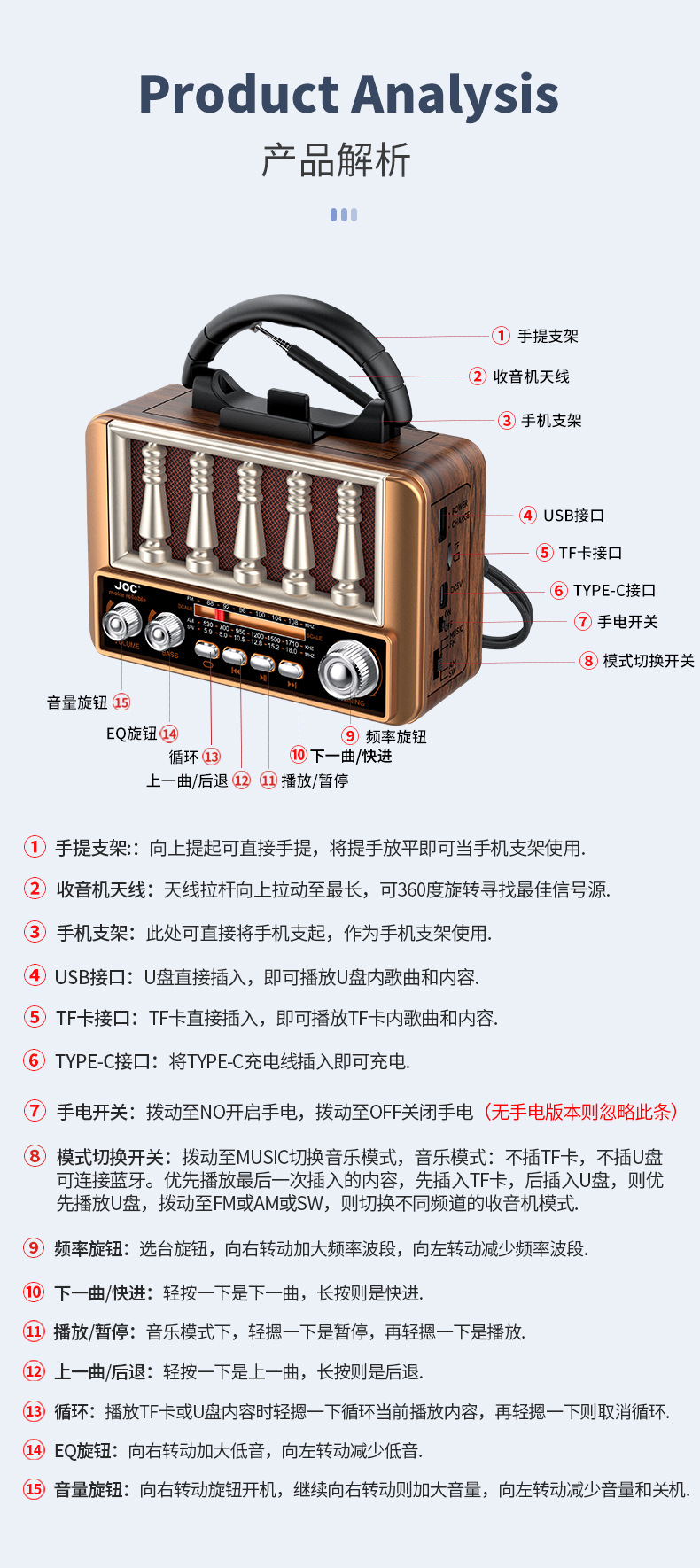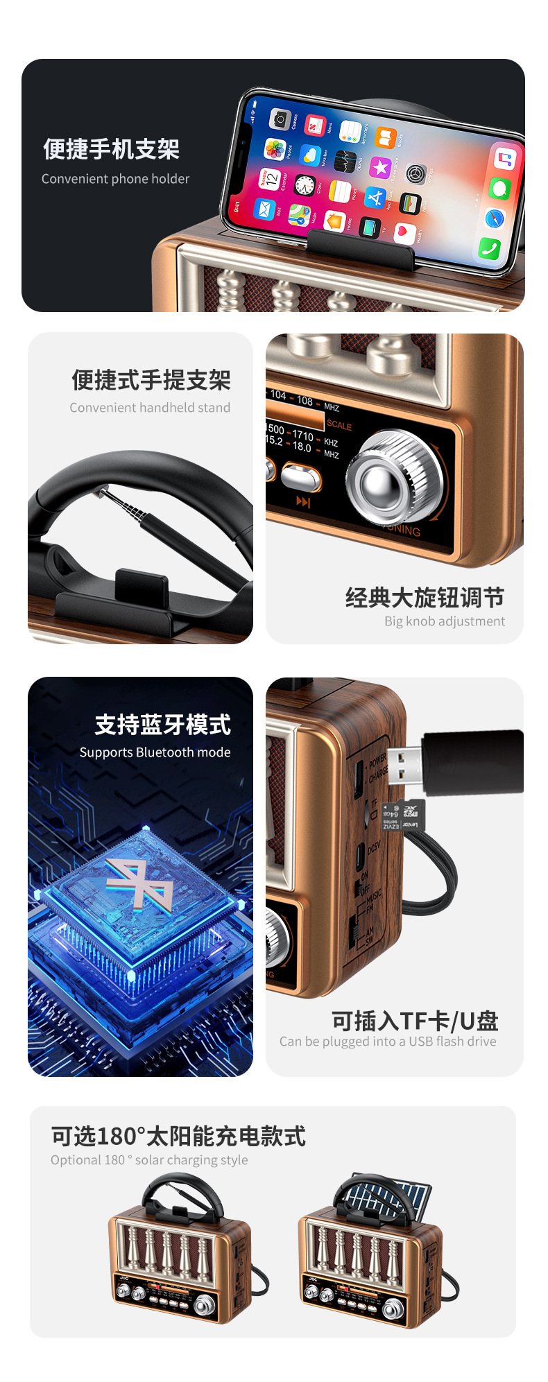 跨境新款多功能收音机太阳能复古蓝牙收音机调频多波段收音机厂家