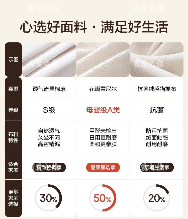 尺寸 【猫抓布 | 5A级10防抗菌】,【雪尼尔 | 亲肤母婴级A类】,【流星棉麻 | S级透气棉麻布】