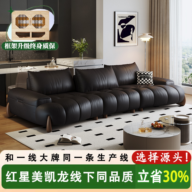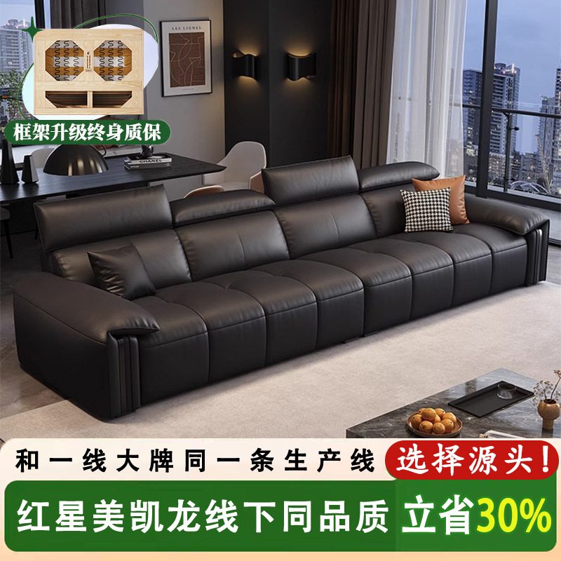 佛山中古風頭層牛革ソファー本革イタリア式極簡象耳黒ストレートソファー高級感