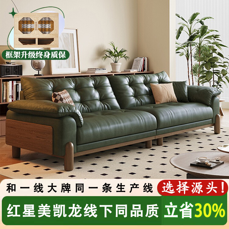 佛山中古風雲ドゥオ本革ソファログスタイル無垢材3人掛けストレートレトロオイルワックスレザーソファリビングルーム