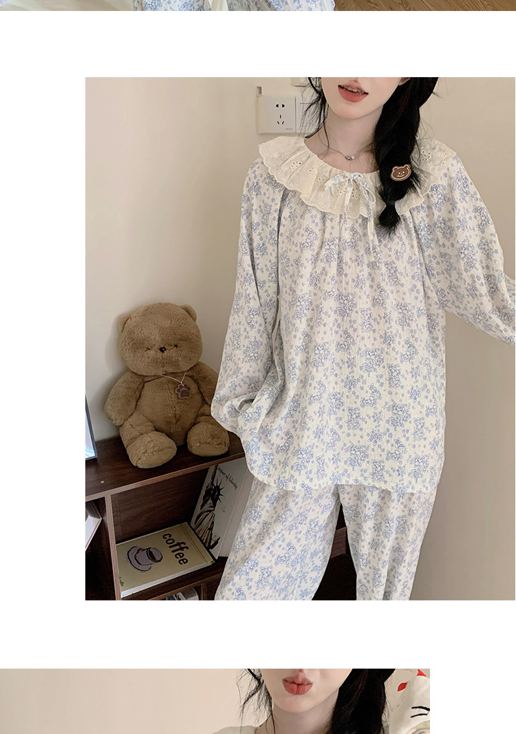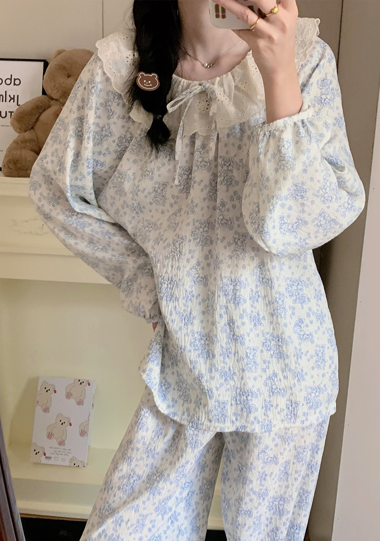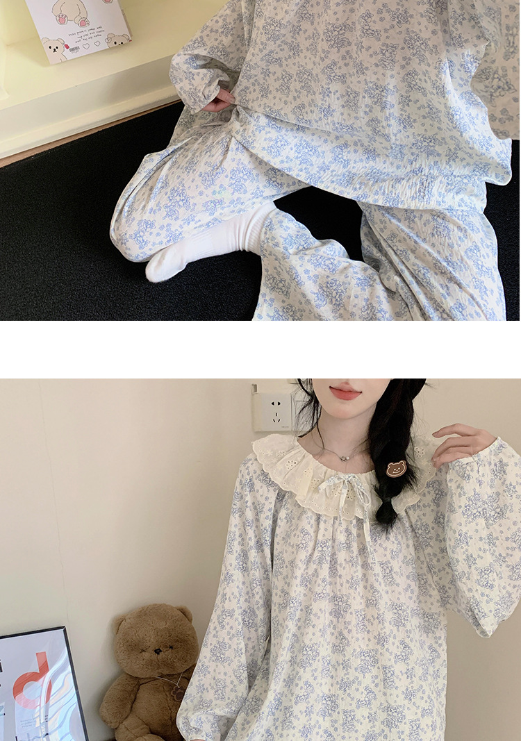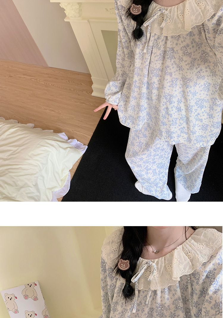 碎花法式睡衣女新款蕾丝花边蝴蝶结春秋季长袖长裤学生家居服套装