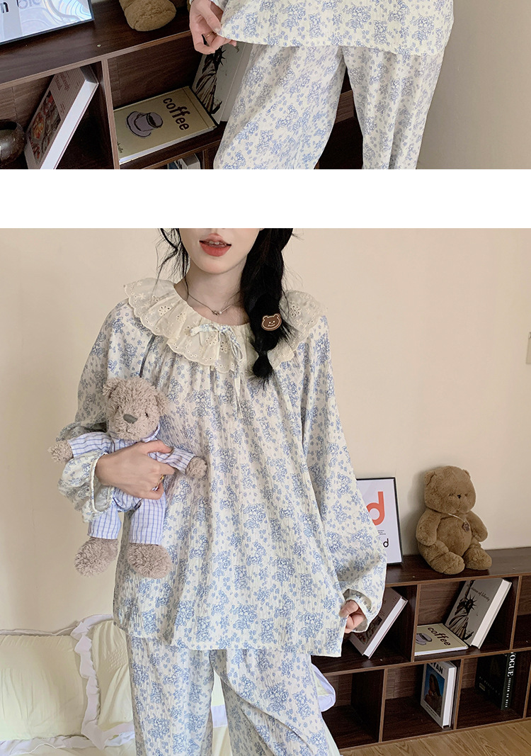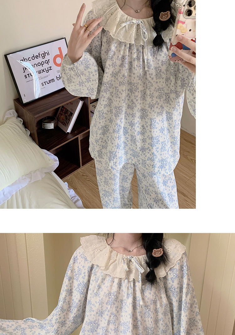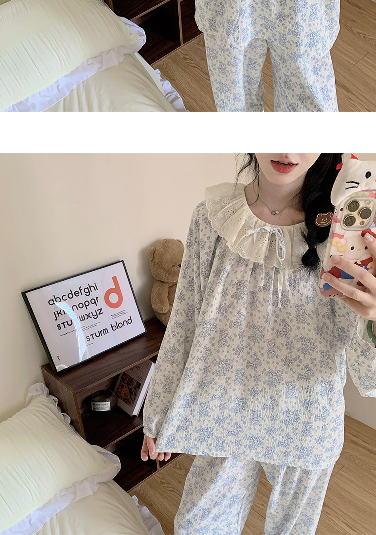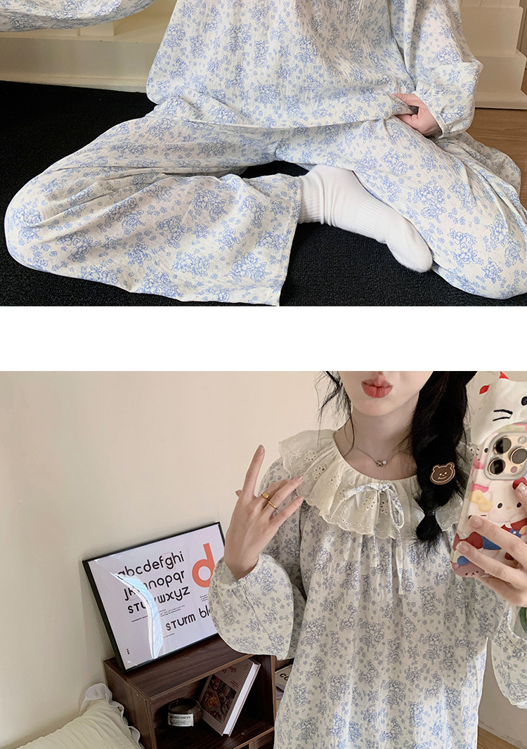 碎花法式睡衣女新款蕾丝花边蝴蝶结春秋季长袖长裤学生家居服套装