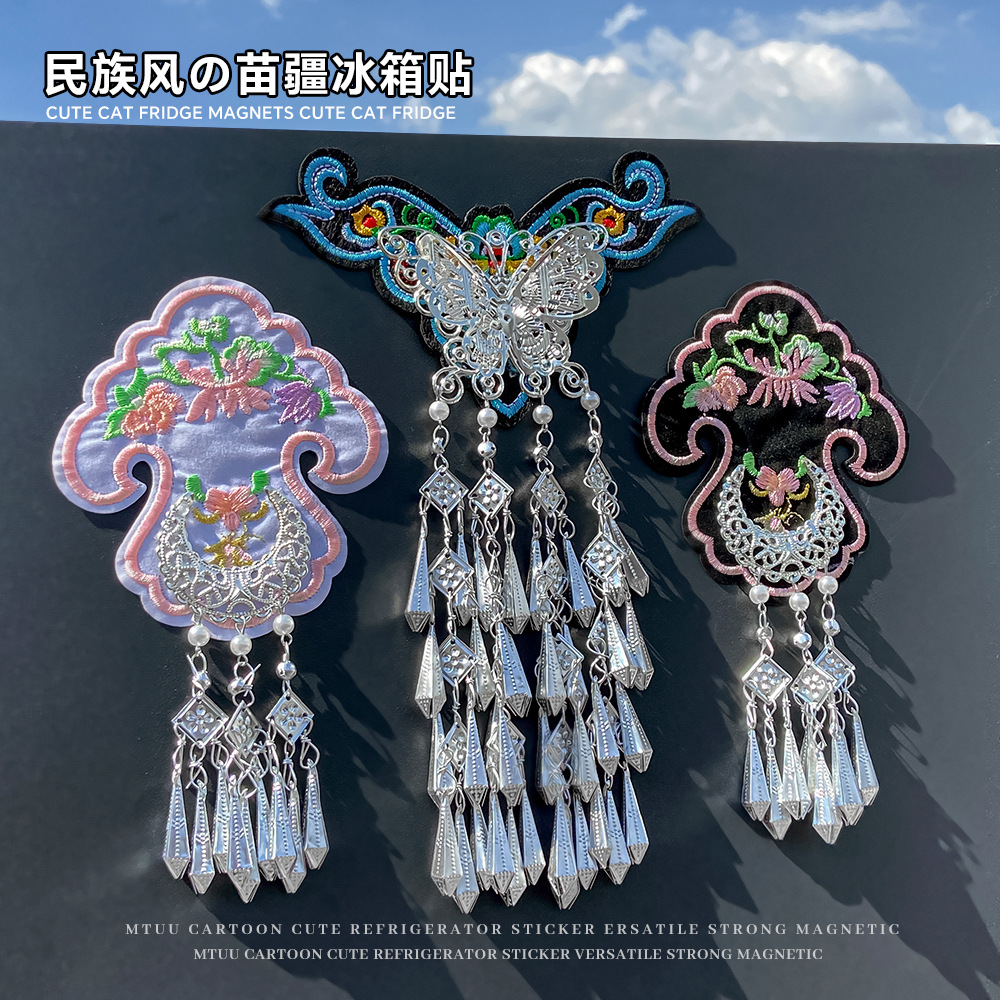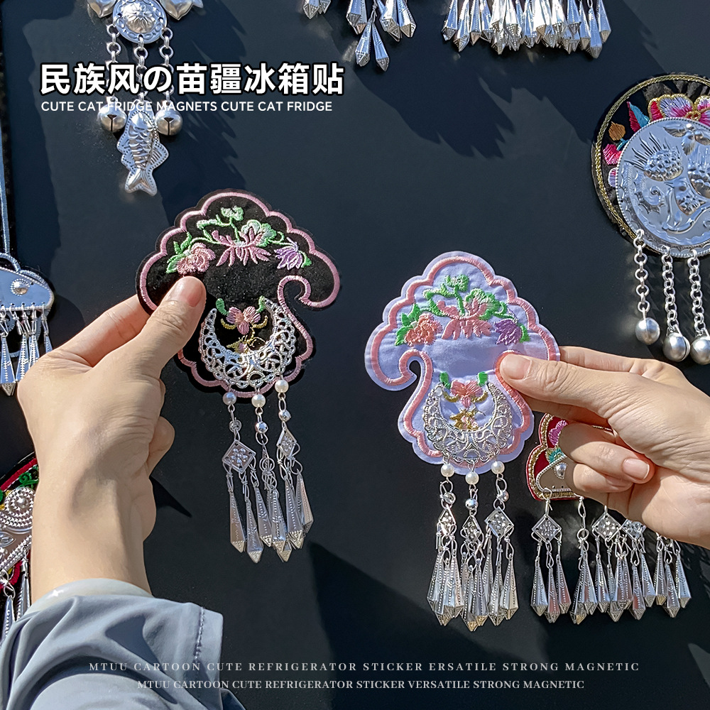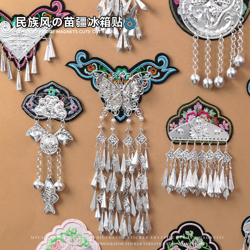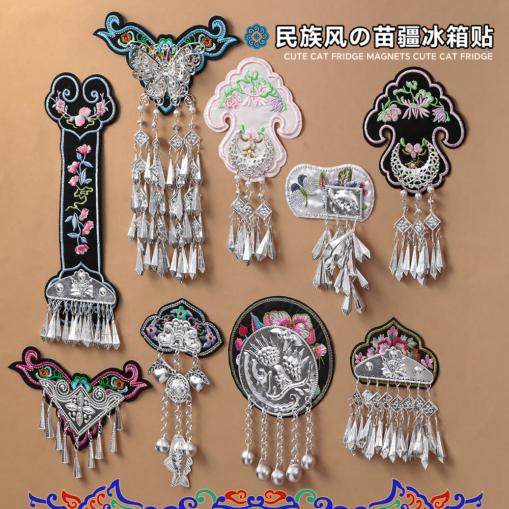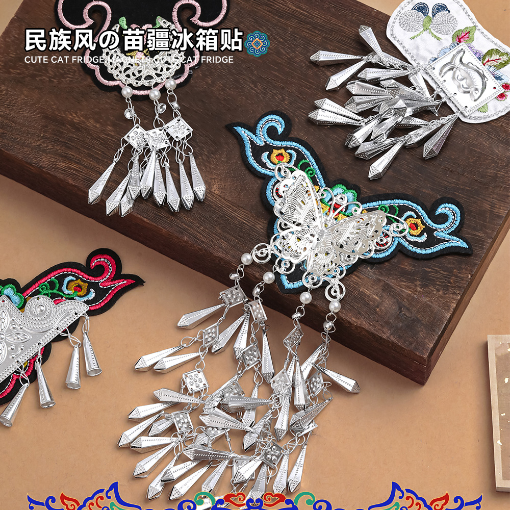 貴州ミャオ族の特徴的なエスニックスタイルの手作りミャオ族刺繍磁気冷蔵庫マグネット刺繍ミャオ族シルバータッセル文化的で創造的な記念ギフト