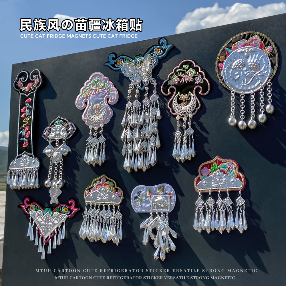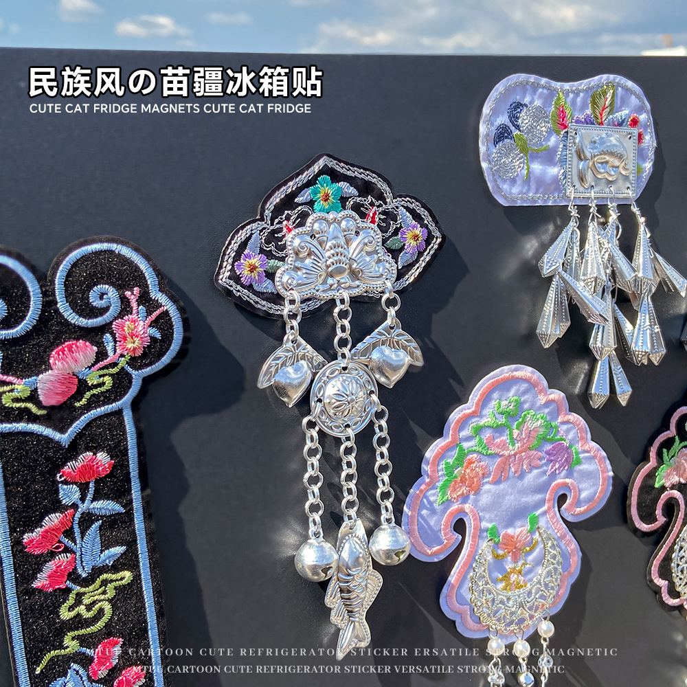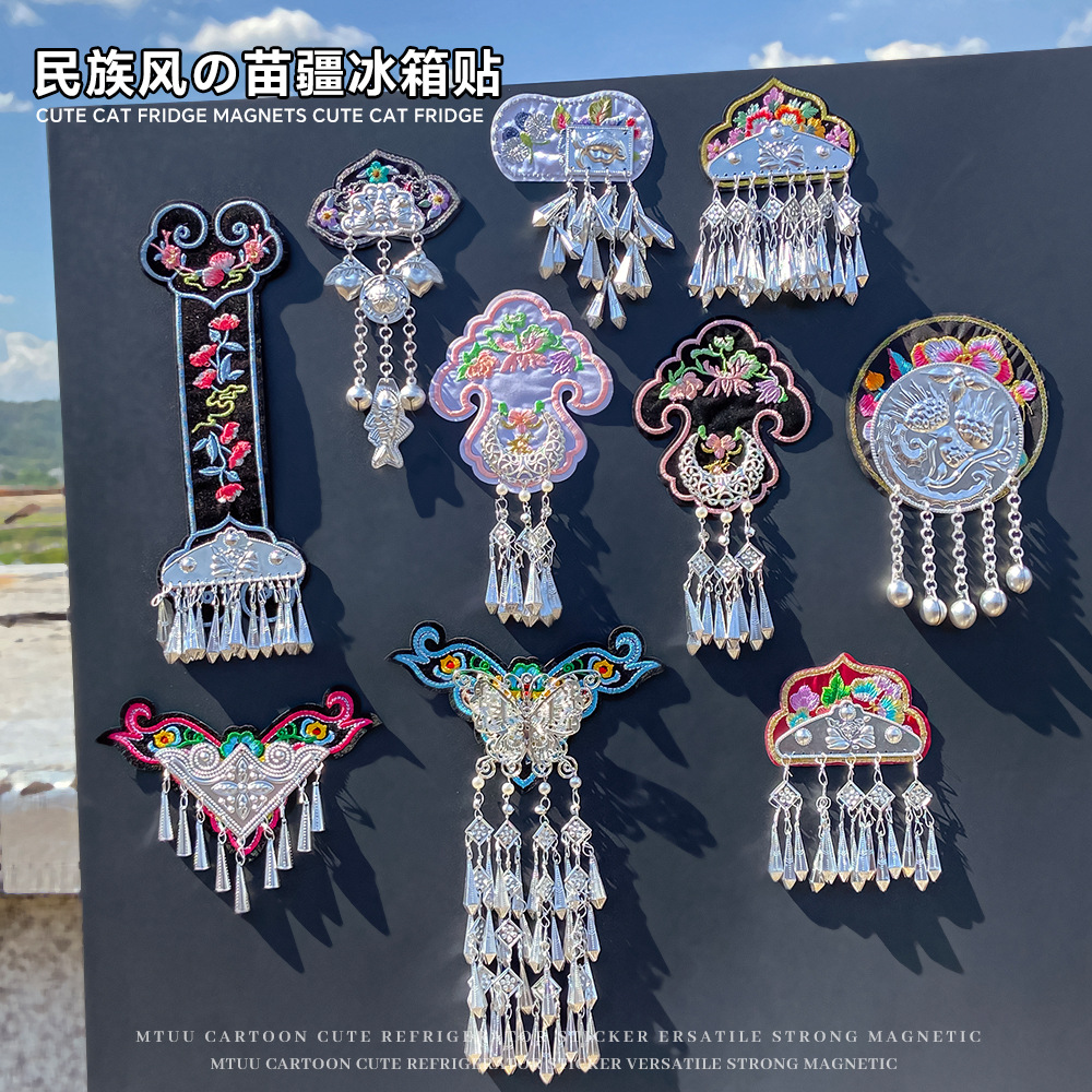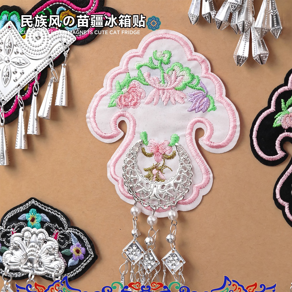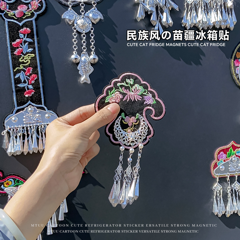 貴州ミャオ族の特徴的なエスニックスタイルの手作りミャオ族刺繍磁気冷蔵庫マグネット刺繍ミャオ族シルバータッセル文化的で創造的な記念ギフト