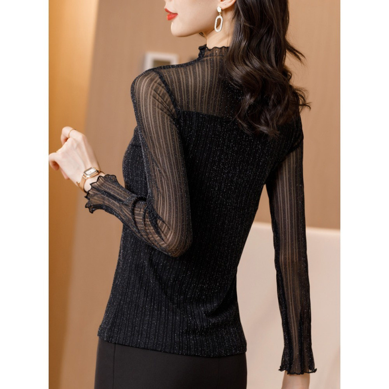 半高襟レースの底のシャツの女性の中で秋の服の2025年の新型の網の紗の小さいシャツの黒色の長袖のtシャツの上着を掛けます。