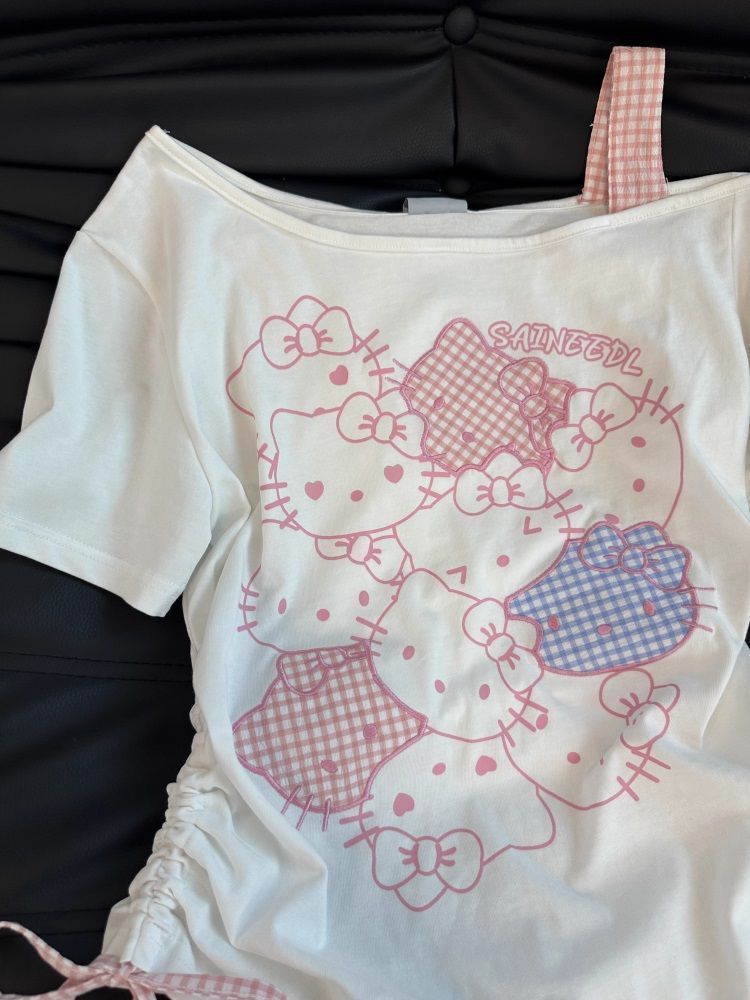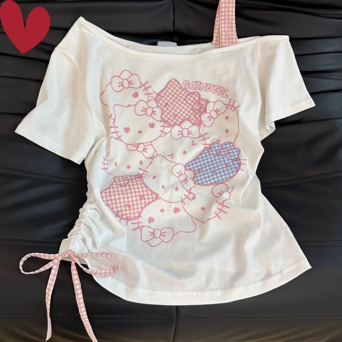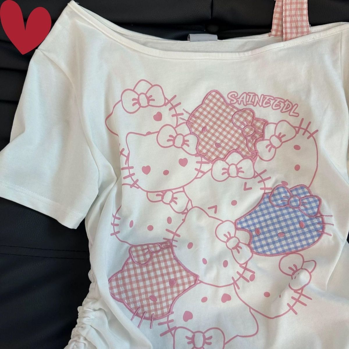 可爱Kitty猫咪印花蝴蝶结斜肩短袖t恤女夏季修身露肩不规则小上衣