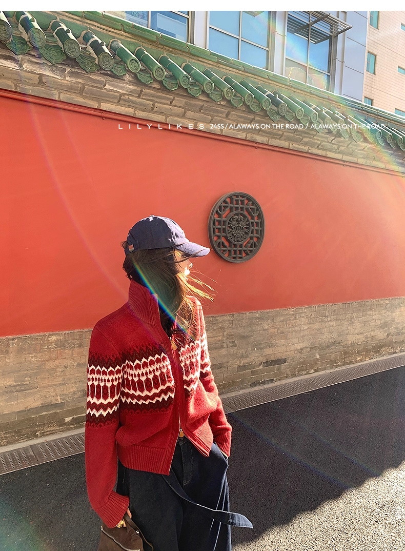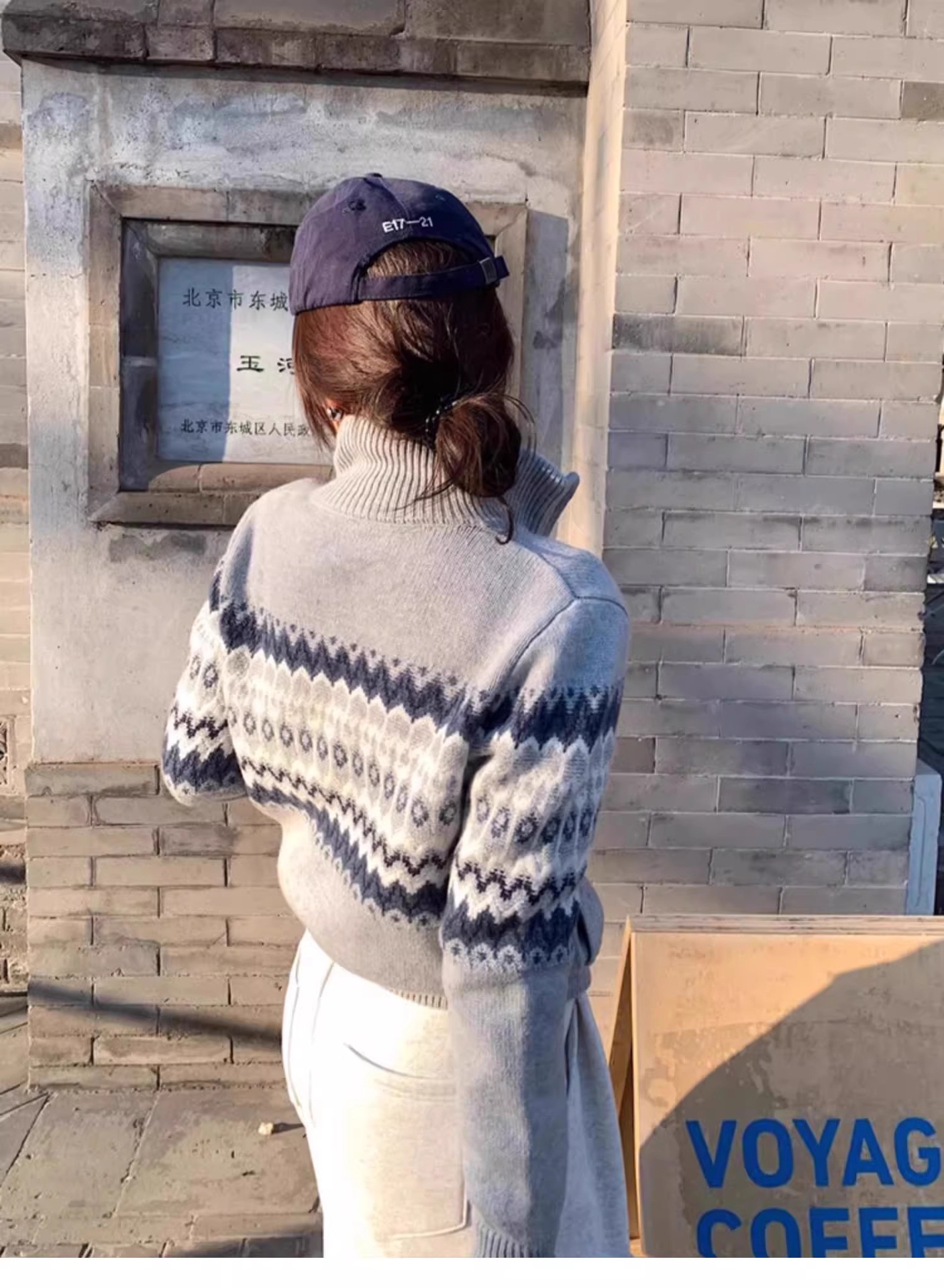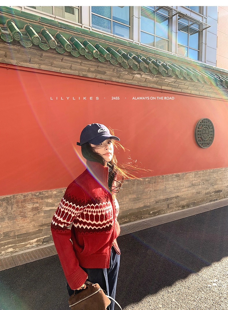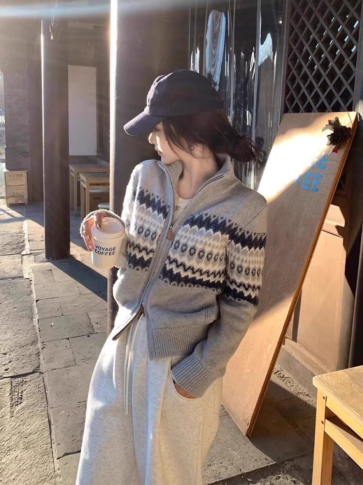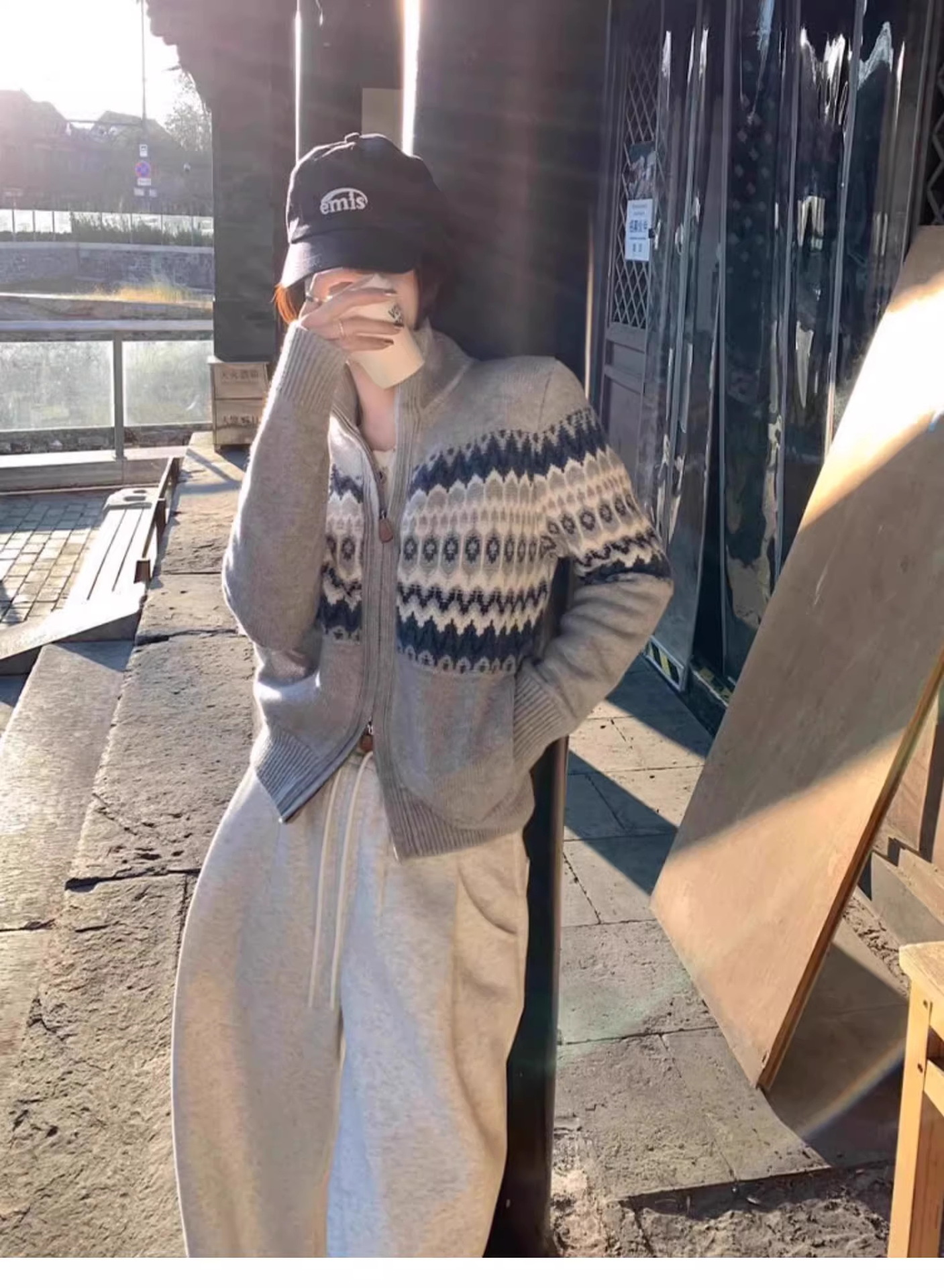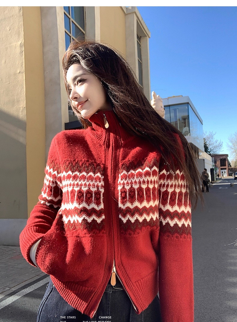 润施费尔岛毛衣开衫拉链立领羊毛开衫外套女秋季提花外穿宽松开衫