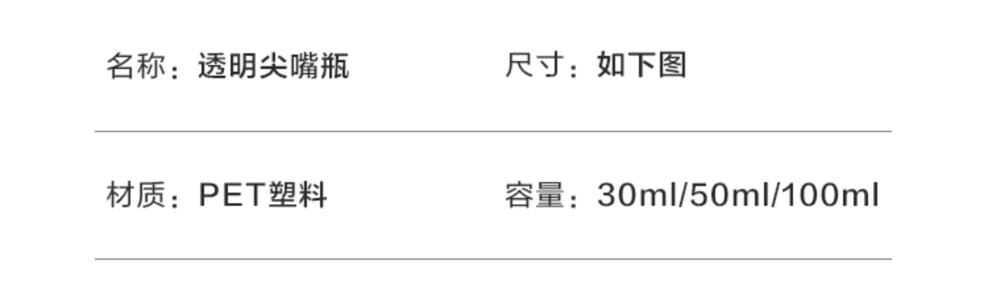 规格型号 30ML透明尖嘴1个【可挤压】;透明;PET,50ML透明尖嘴1个【可挤压】;透明;PET,100ML透明尖嘴1个【可挤压】;透明;PET