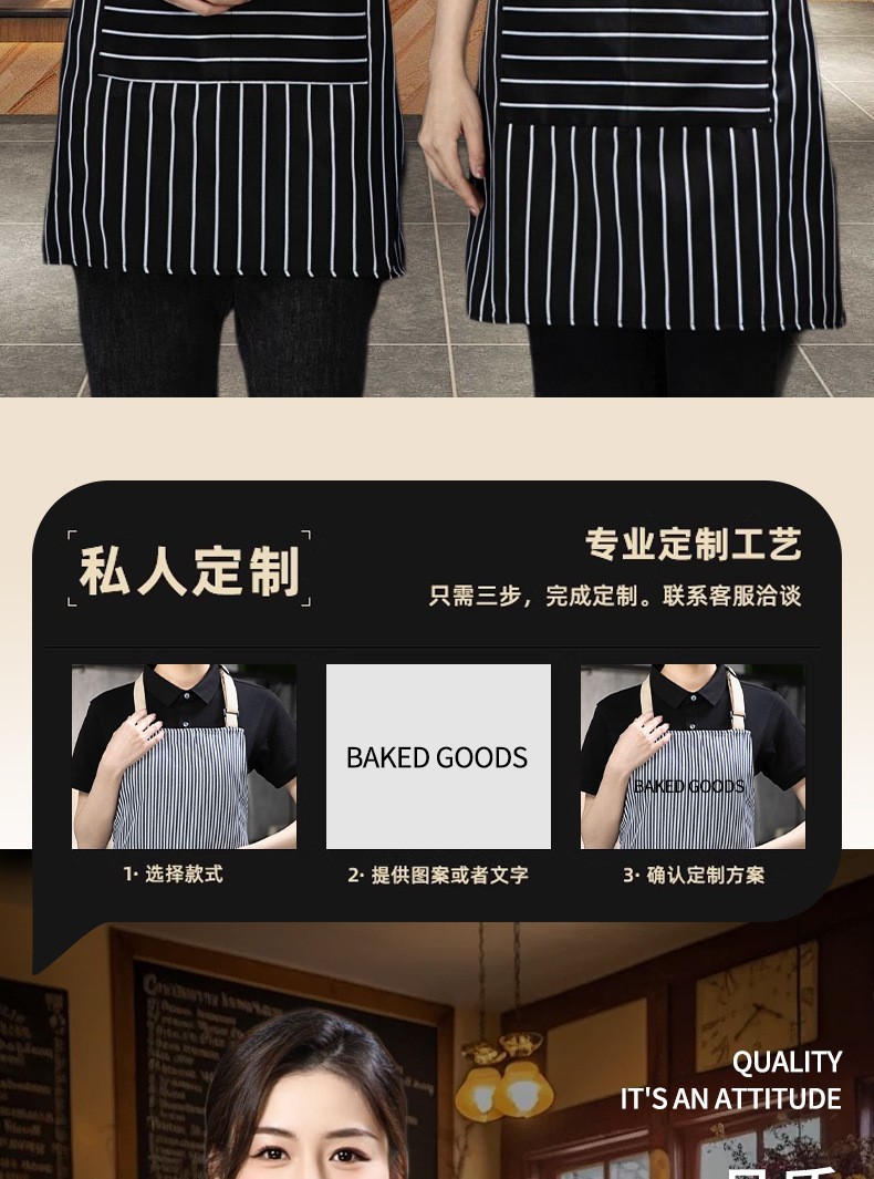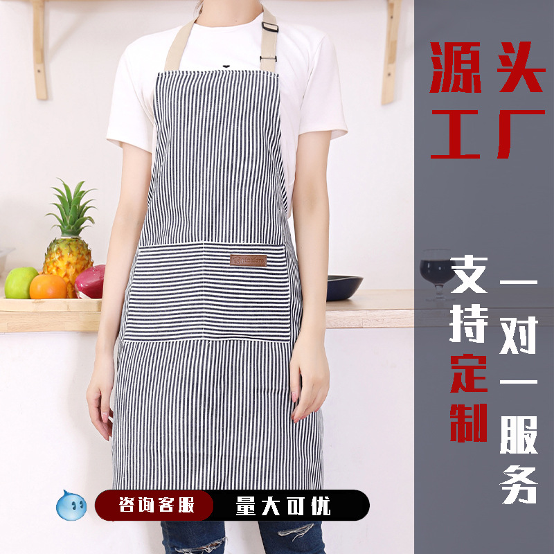 夏季薄款棉麻条纹挂脖围裙厨房咖啡店烘培围裙工作服可印logo