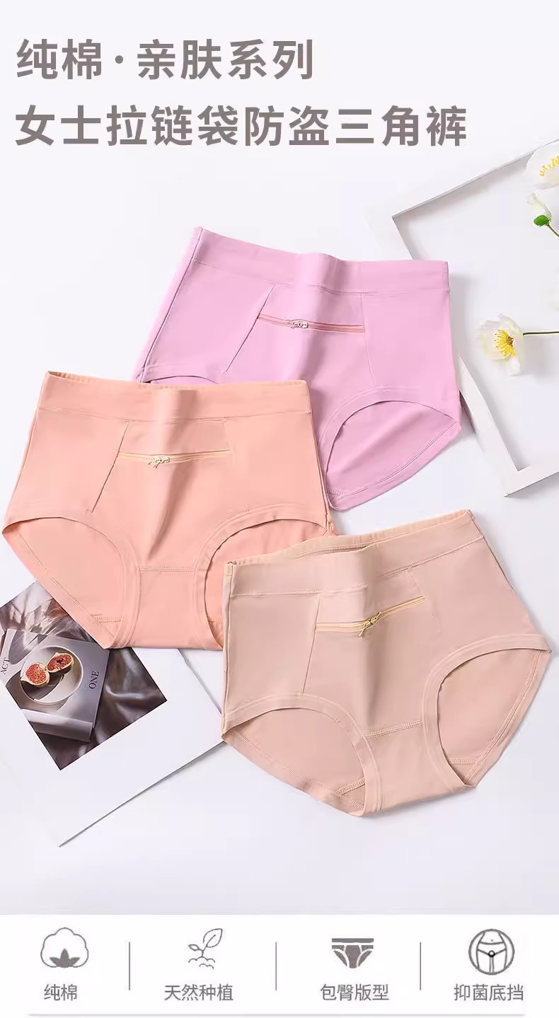 纯棉高弹力高腰女士拉链袋防盗三角裤亲肤舒适透气抑菌加大码内裤