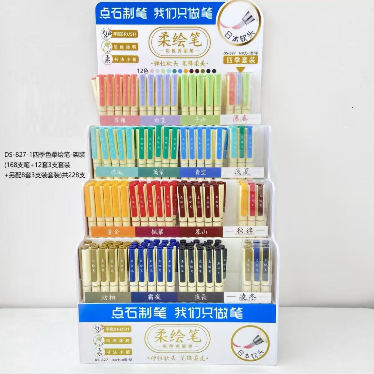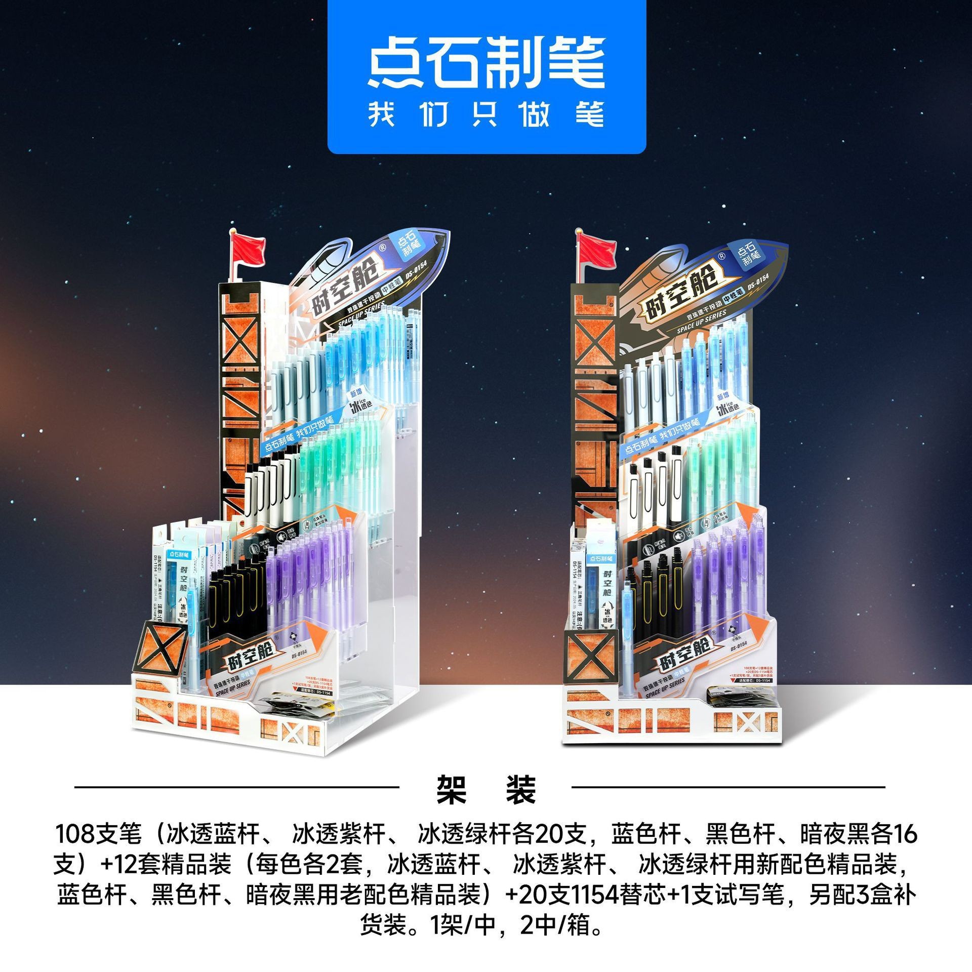 笔芯颜色 DS-7144深海舱 ·潜艇钢笔架装,DS-0145深海舱·航海中性笔架装,DS-784按动钢笔架装-可擦蓝 43套/架,DS-7158时空舱小舱门按动钢笔架装-魔液可擦蓝,DS-7154时空舱不溅墨细尖钢笔架装-可擦蓝,DS-7157火箭时空舱不溅墨细尖钢笔架装-魔液可擦蓝,DS-827-1四季色柔绘笔168支笔+12套3支套装+另配8套3支装套装,DS-827-1新国色柔绘笔168支笔+12套3支套装+另配8套3支装套装,DS-827新款荧光色柔绘笔架装,DS-ZJ005红笔家族架装,DS-099复古色速干大容量按动中性笔精选10色展架,904直液式18色架装【360支装】,DS-8157闪电时空舱按动荧光笔-架装,DS-805S按动荧光笔精选12色-展架装(180支笔+24支替芯+12套套装),DS-0201玩转时空舱双珠速干按动中性笔架装,DS-0154G寻梦时空舱双珠速干按动中性笔架装,0171极光静音架装,DS-0155畅“响”时空舱双珠速干按动中性笔-架装,DS-6254巡航时空舱三色按动中性笔架装,DS-5A-S 5A备考笔架装,DS-0110指间温柔双珠速干按动中性笔架装,88支/架,DS-0197回形夹双珠速干按动中性笔架装,DS-8164时空舱霓虹赛博软头荧光笔架装,DS-0202巨能刷刷题笔按动中性笔-架装,DS-0204天空之境双珠速干按动中性笔架装,DS-0193AI悬境双珠速干按动中性笔架装,DS-0192A1未来双珠速干按动中性笔架装,DS-0194银河时空舱旋转中性笔-架装,DS-5144活动铅笔-插盒装