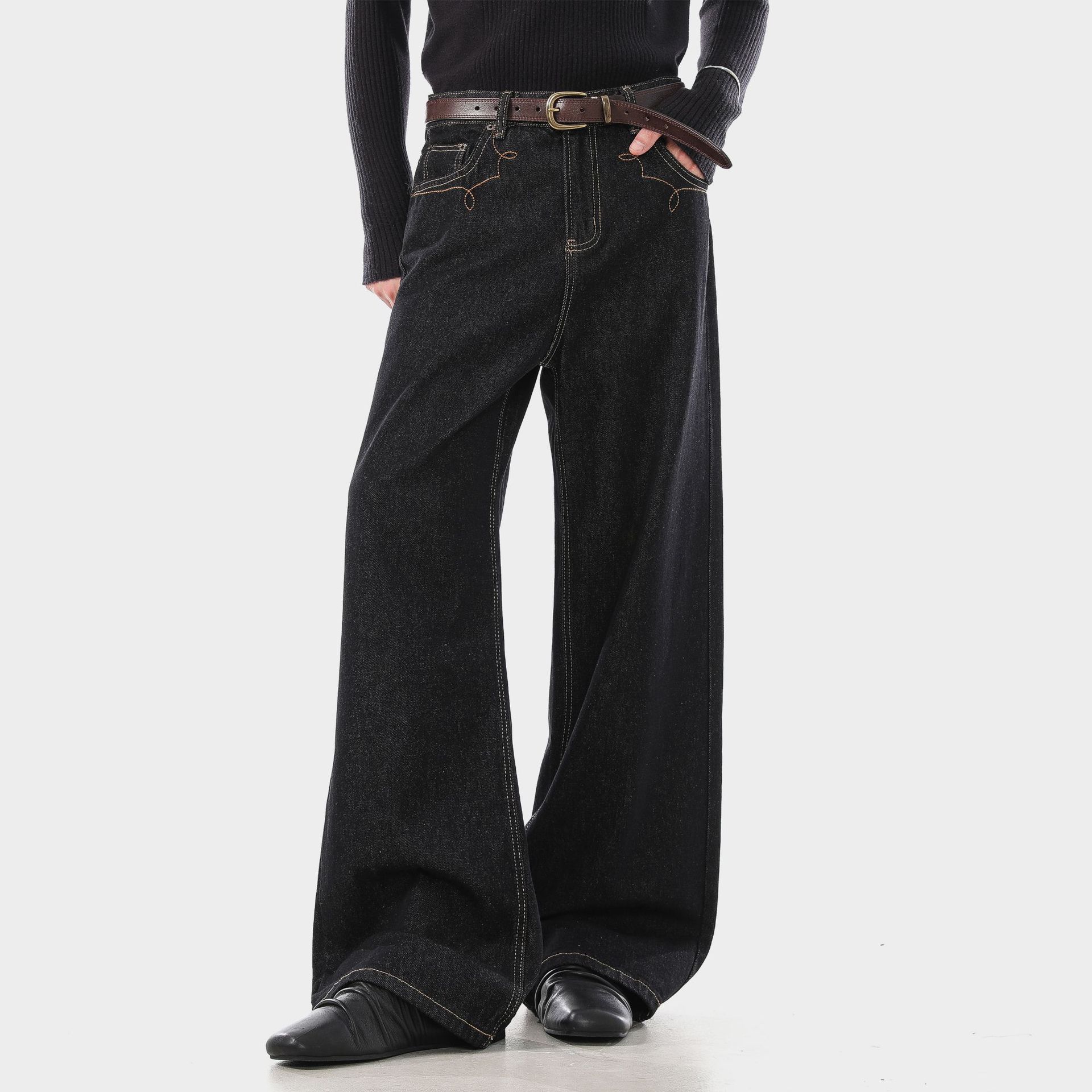 美式复古水洗做旧黑色明线牛仔裤男女直筒微喇cleanfit裤子