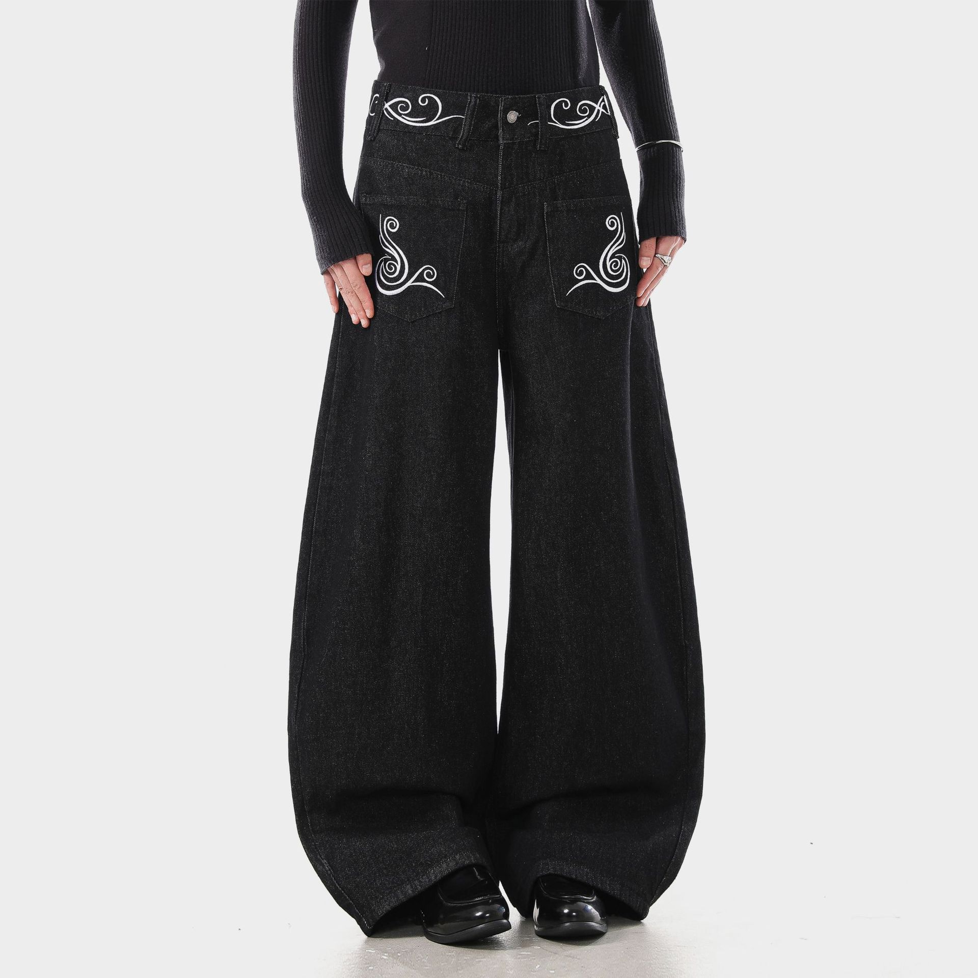 美式复古水洗廓形刺绣口袋弯刀牛仔裤高街原牛宽松潮流阔腿长裤子