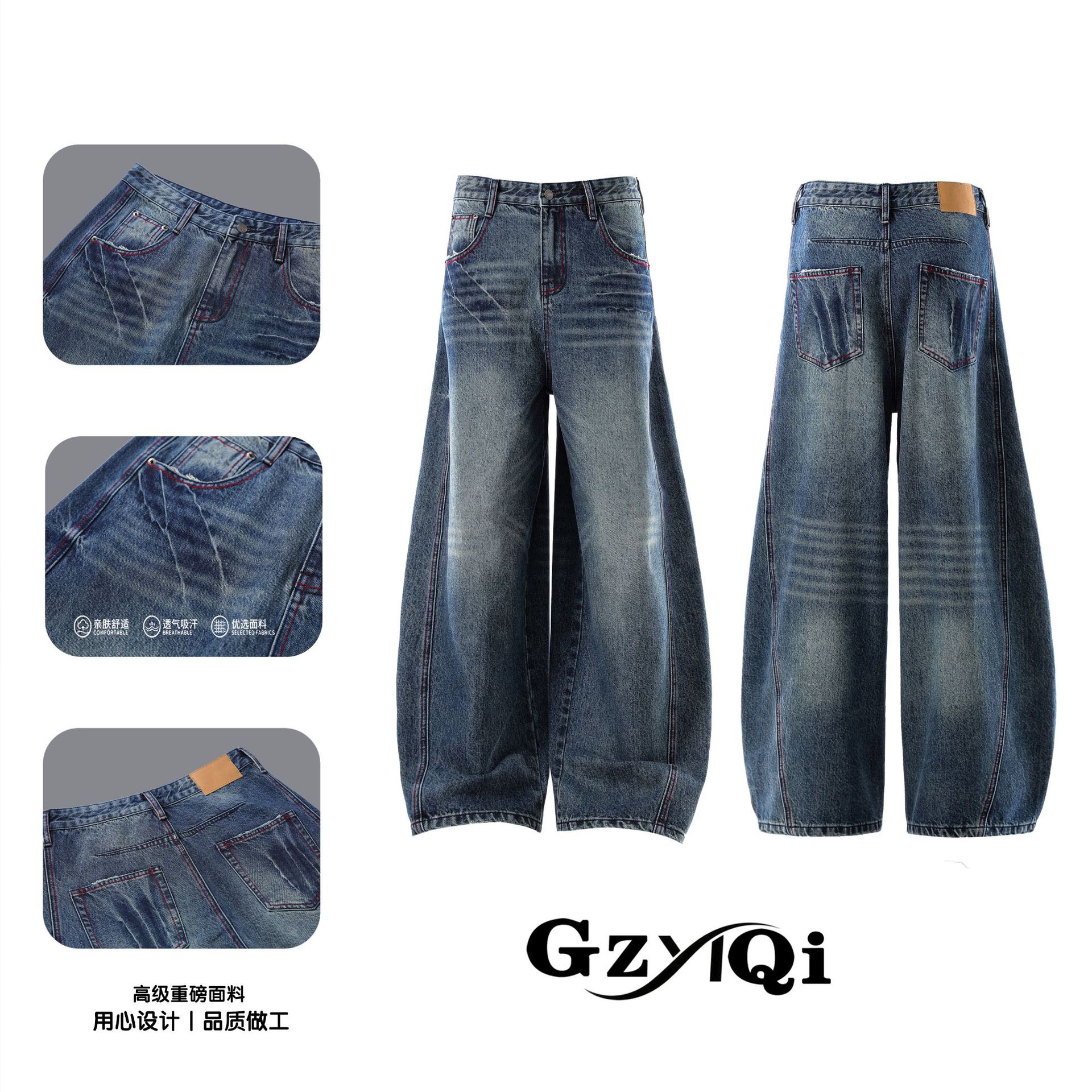 美式高街复古猫须水洗弯刀牛仔裤男女cleanfit宽松阔腿长裤子
