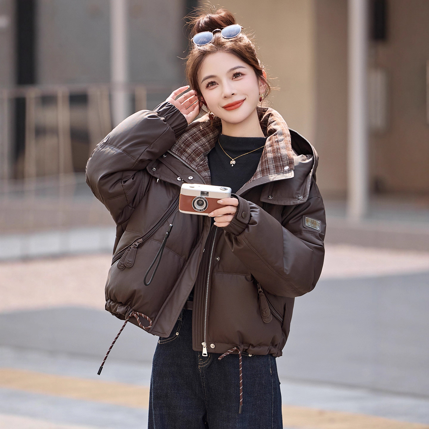 2025冬季新款高级感格子连帽短款羽绒服女50白鸭绒加厚保暖外套潮