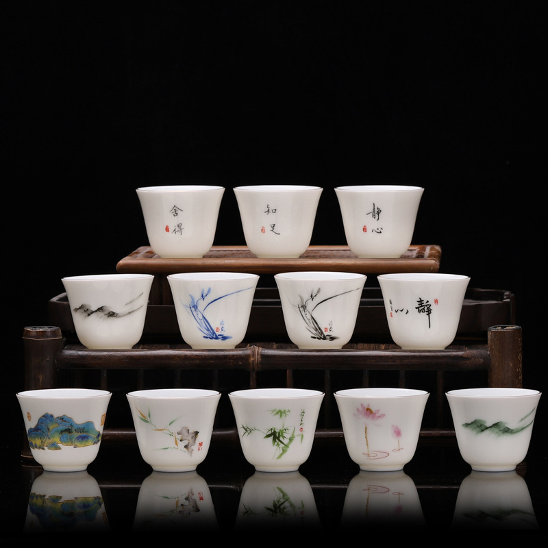 手描き茶杯 羊脂玉茶杯 マスターカップ 陶器製小茶杯 カンフー茶杯 白磁単杯 茶碗 卸売