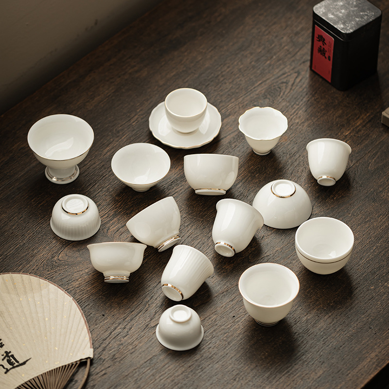羊脂玉茶杯 白磁 カンフー茶器 茶道具 陶磁器 金縁 茶鑑 茶杯 主人杯 国潮風 茶道用