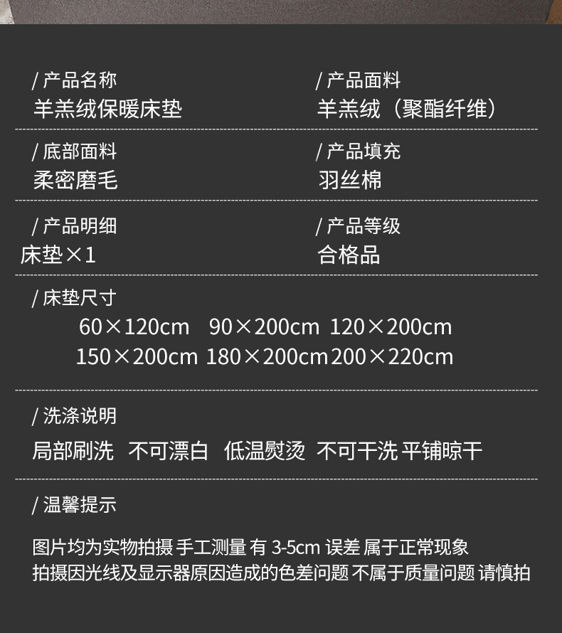 尺寸规格 90x200cm(羊羔绒保暖床垫),120x200cm(羊羔绒保暖床垫),150x200cm(羊羔绒保暖床垫),180x200cm(羊羔绒保暖床垫),200x220cm(羊羔绒保暖床垫),60x120cm(羊羔绒保暖床垫))