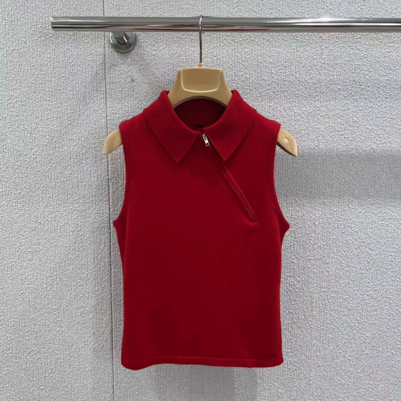 南油女装M家25秋冬季新款修身显瘦红色Polo领针织衫背心上衣女