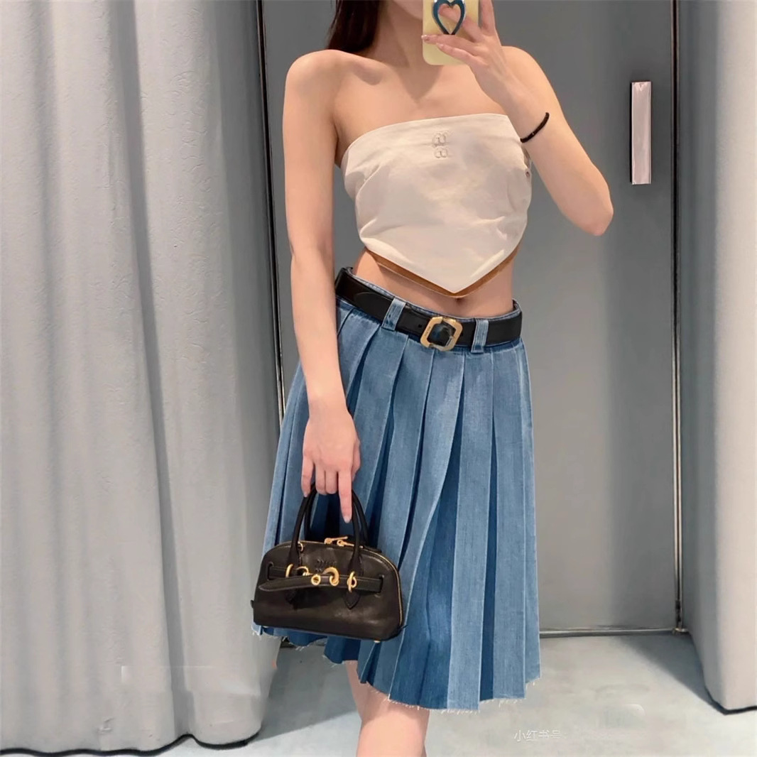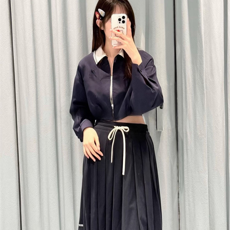 25早秋新款南油高定Miu简约休闲百搭抽绳绑带刺绣字母百褶中裙