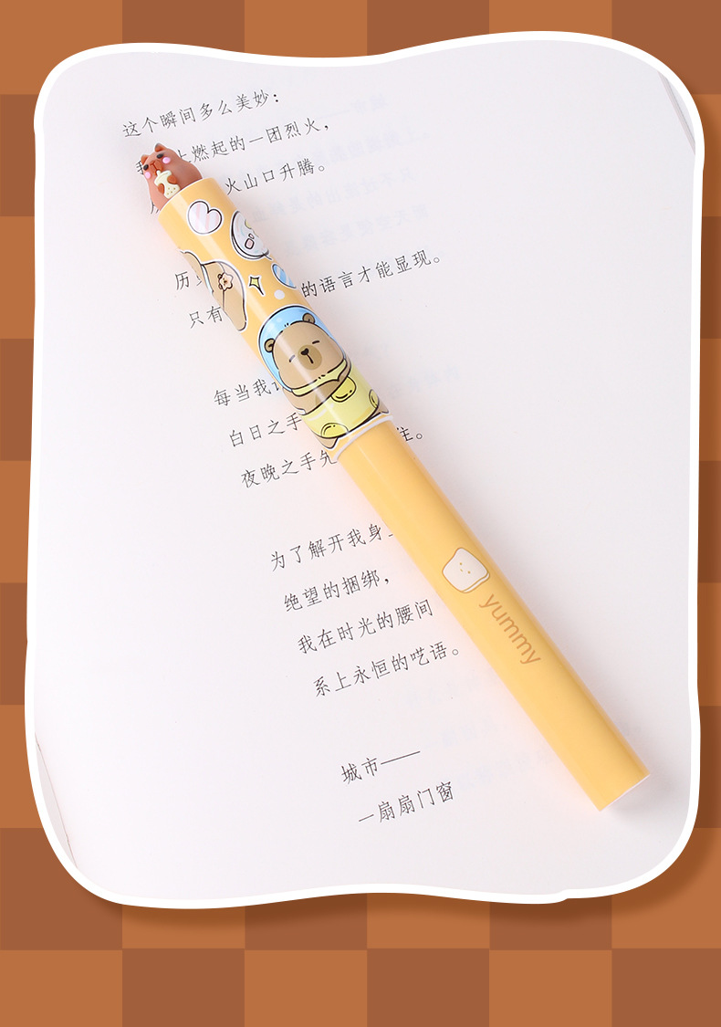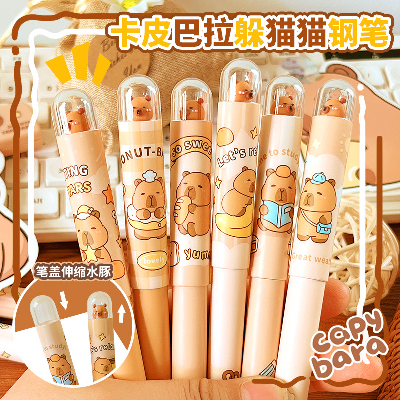 カピバラは猫の万年筆をかくれようとしています。小学生三年生はインクを吸ってインクを交換することができます。