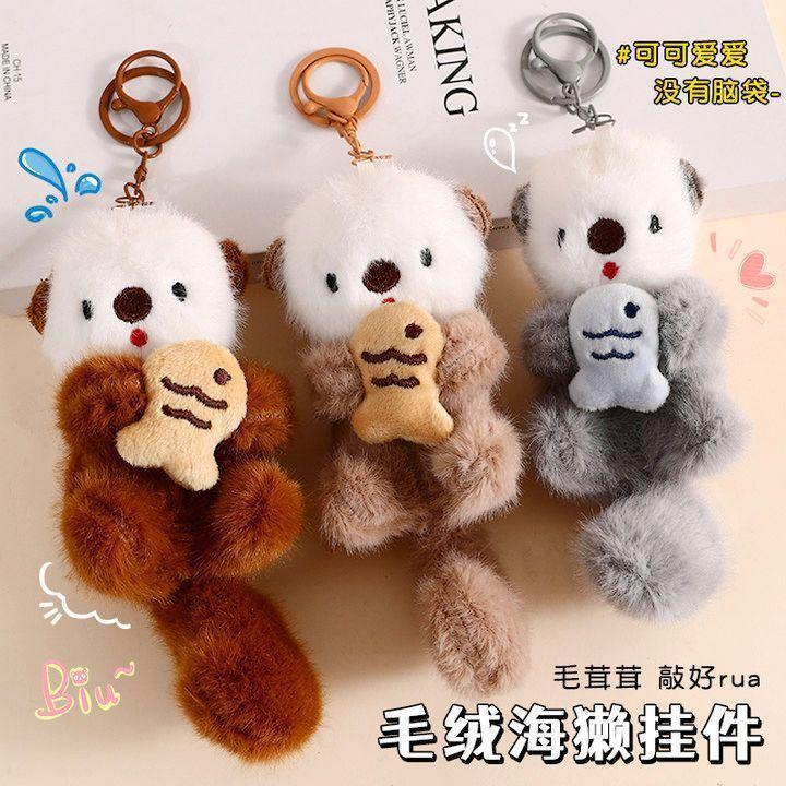 かわいい小さなラッコが魚のぬいぐるみを抱いて人形を飾ってプレゼントします。
