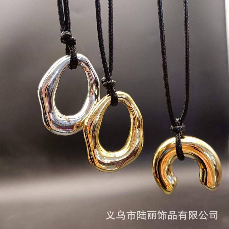 欧美跨境饰品女简约几何椭圆蜡绳项饰个性不规则异形镂空吊坠项链