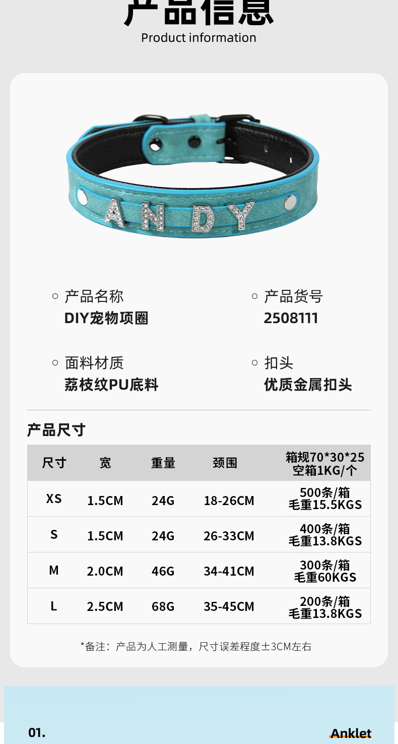犬用首輪 ダイヤモンドDIYネームプレート付きペット首輪用品 DIY自由選択名装飾PUレザー首輪