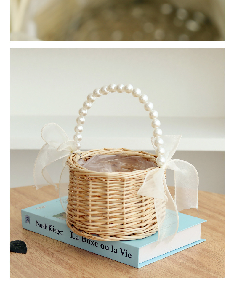 颜色 珍珠提手柳编圆柱新款纯白色丝带花篮,珍珠提手柳编圆柱新款米色纱带花篮