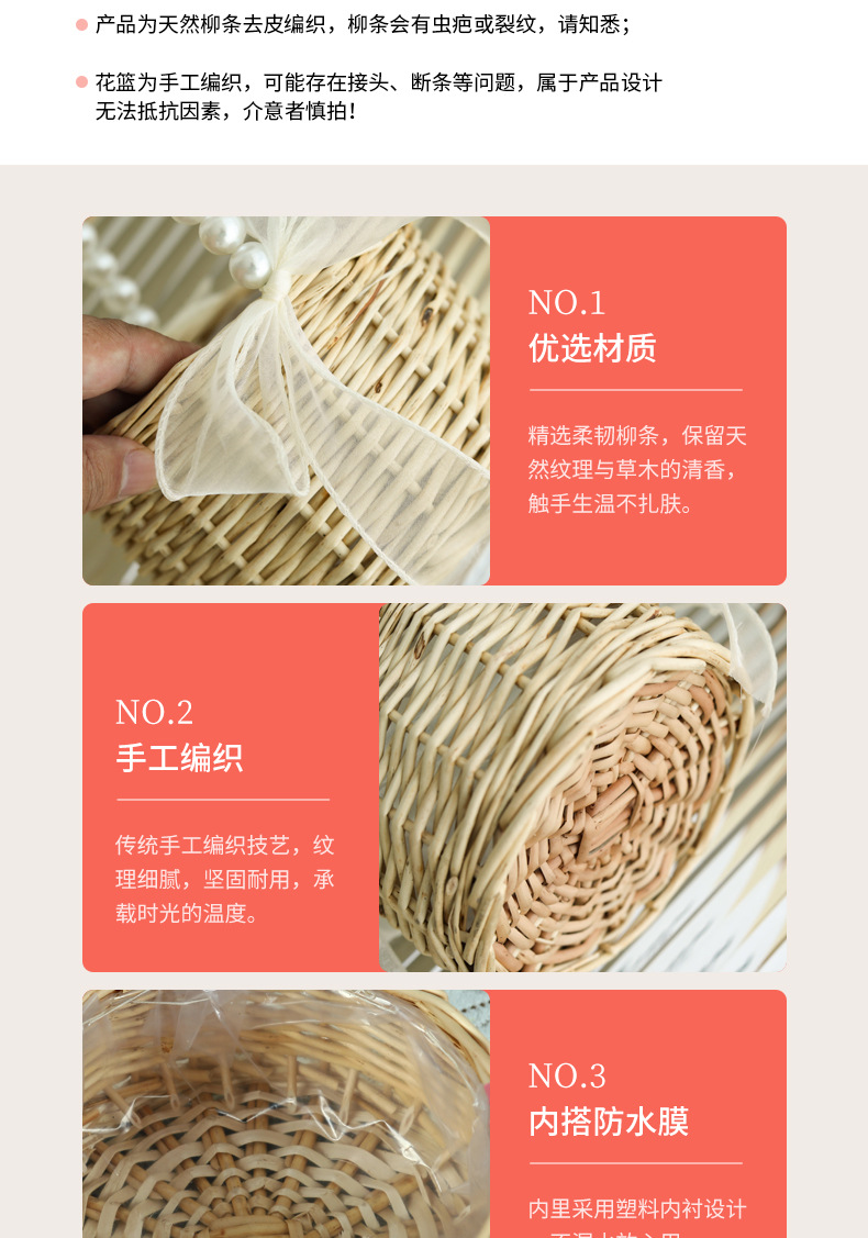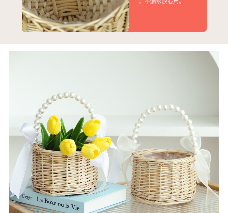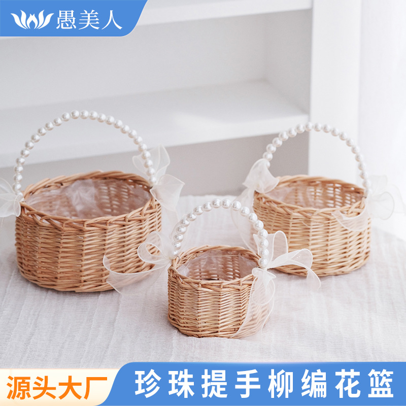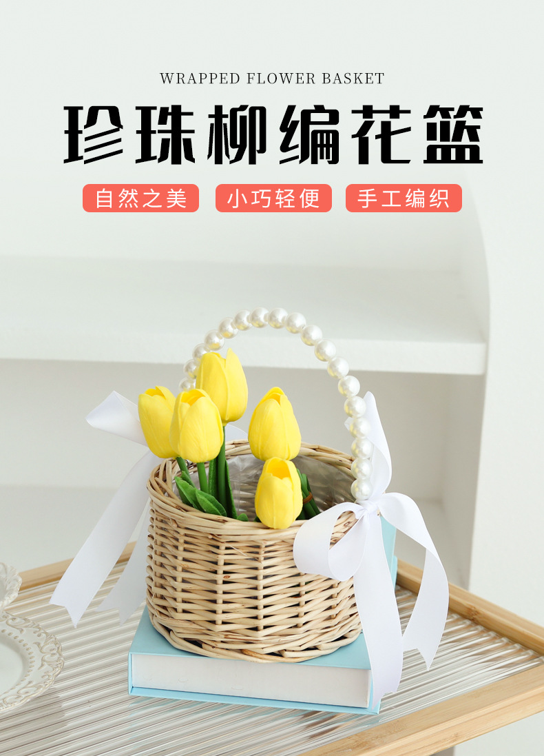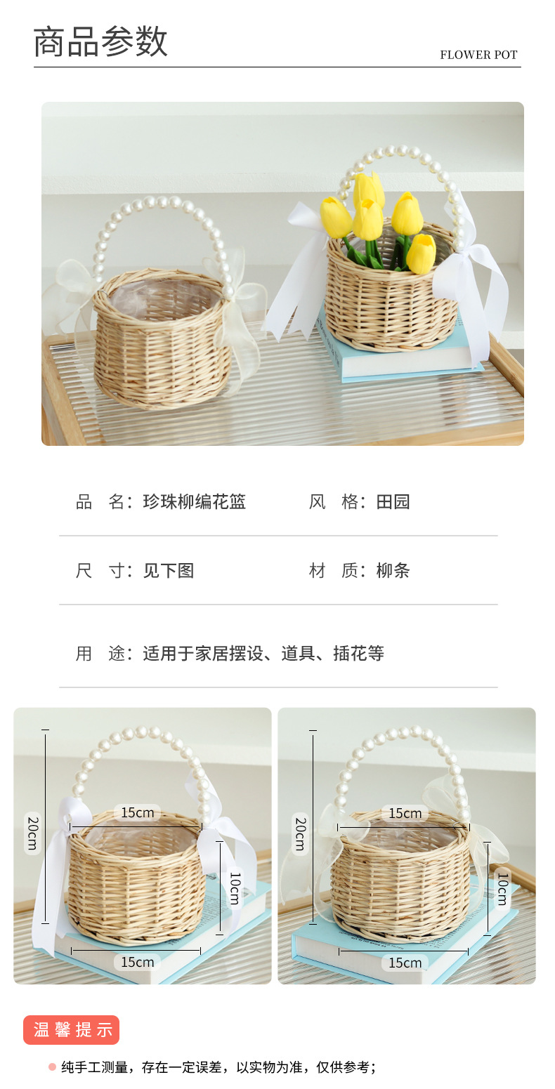 货号 珍珠提手柳编圆柱新款丝带花篮