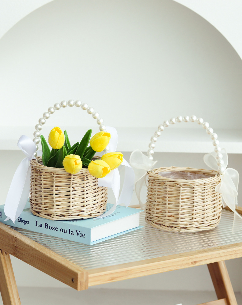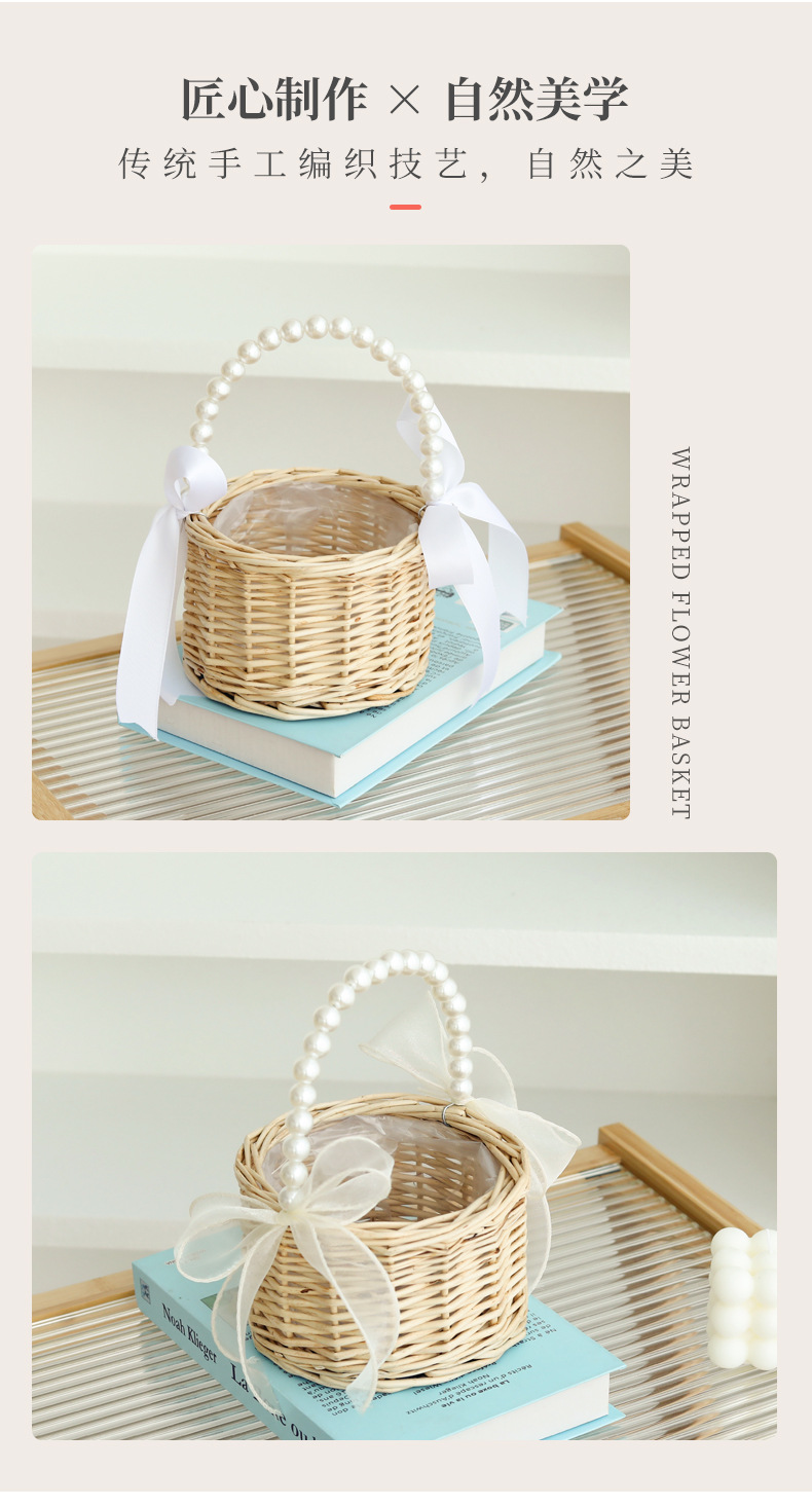 跨境藤编伴手礼手提花篮手工编织珍珠把手收纳篮草编柳编筐花篮子