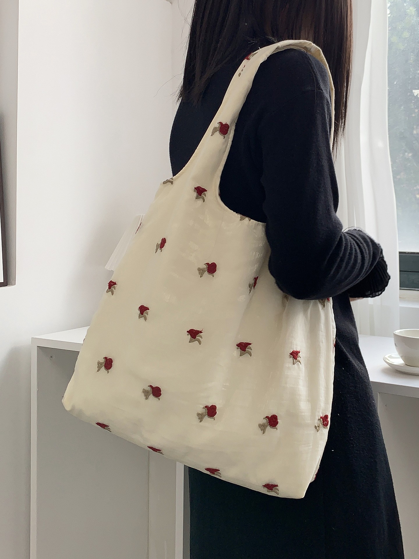 新款玫瑰刺绣高颜值淑女小仙女逛街约会帆布大容量手提托特背心包