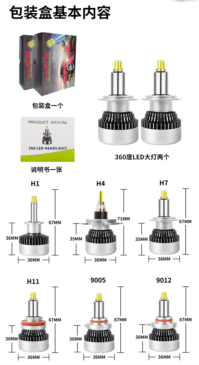 汽车LED大灯360度8面发光H7灯泡改装6000K超亮聚光55Wled车灯无极