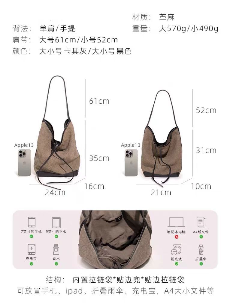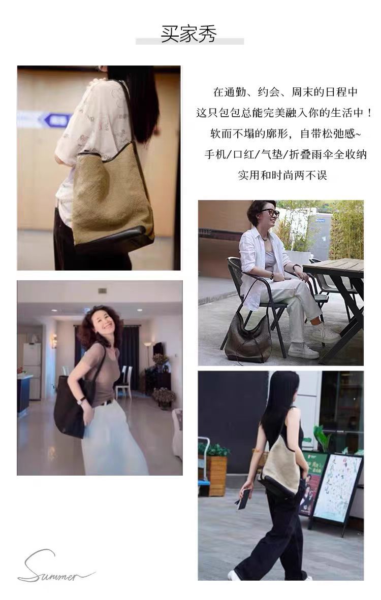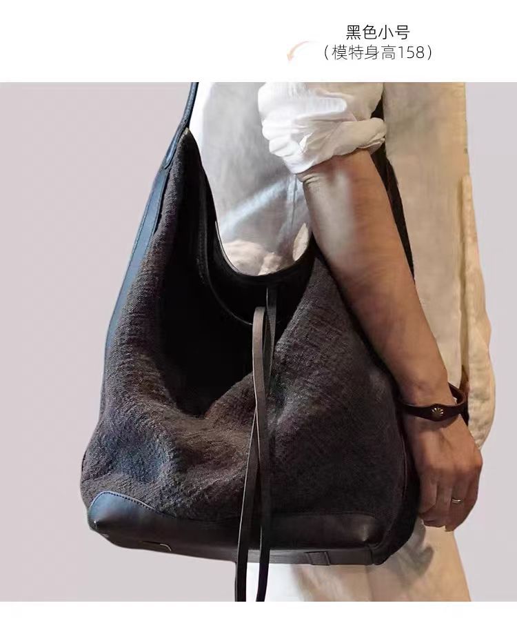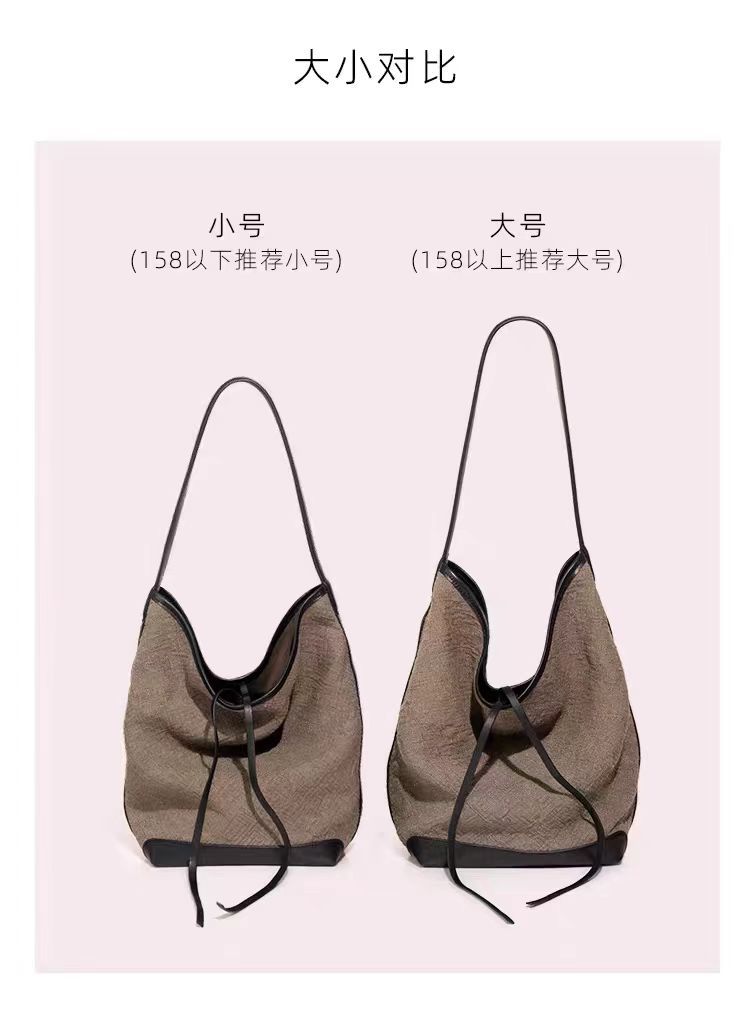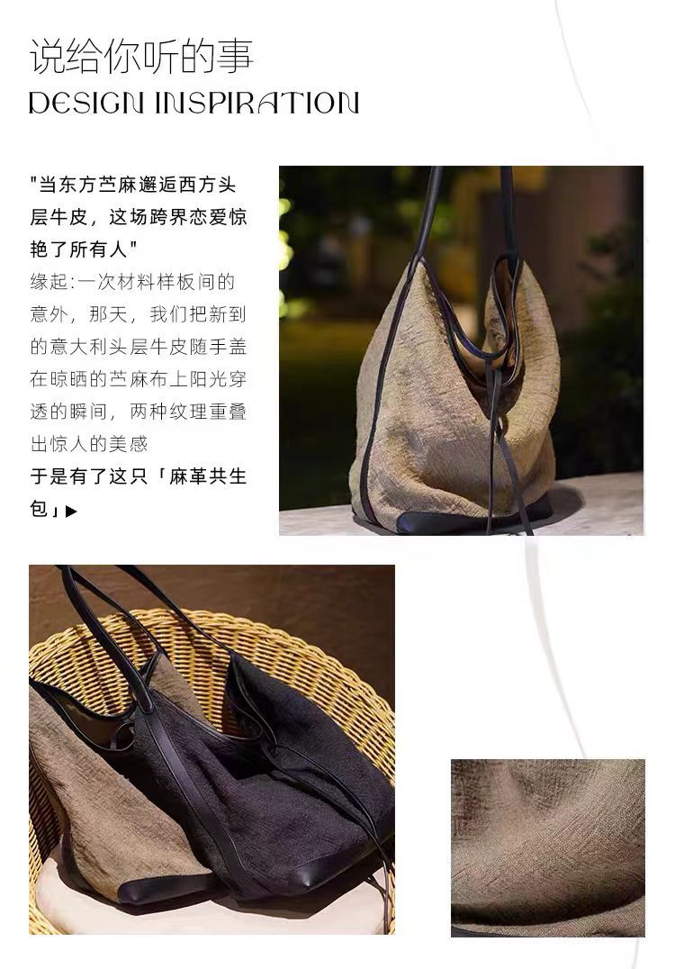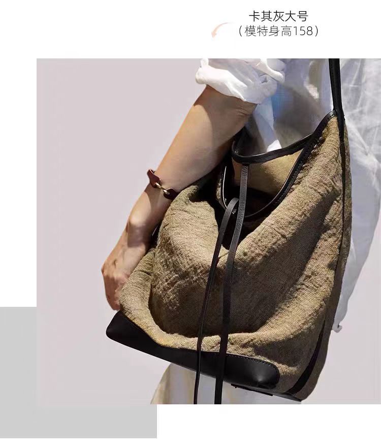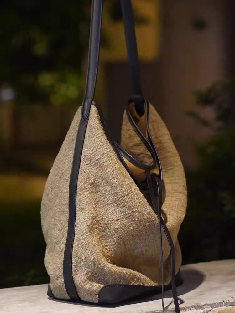 慵懒风包女式2025新款苎麻配头层牛皮单肩腋下托特包大容量水桶包