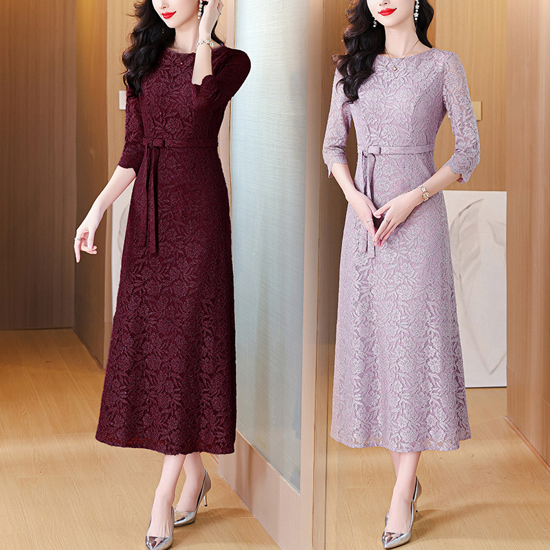 qwfs7756喜婆婆婚宴装礼服裙2025秋冬新款气质蕾丝系带收腰连衣裙