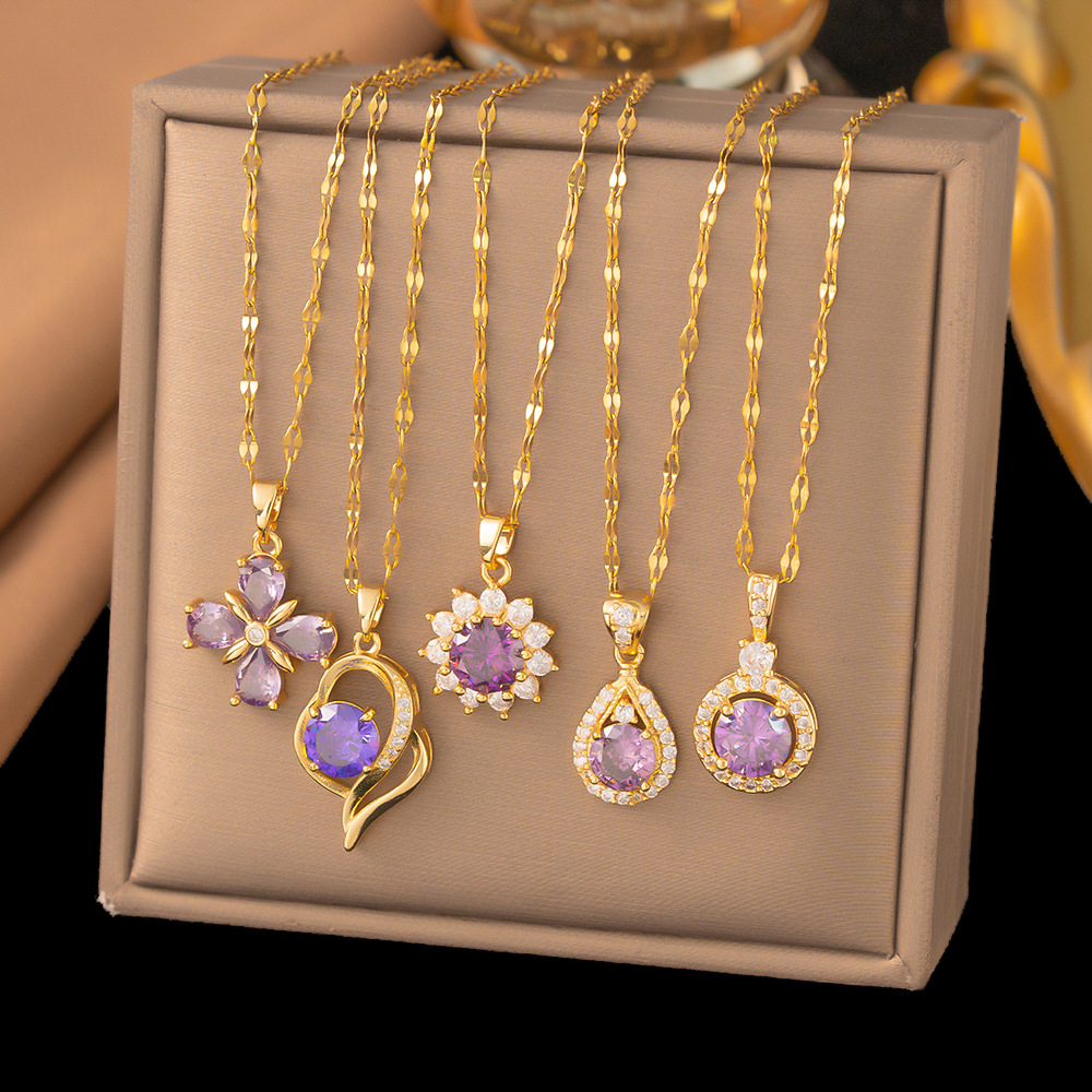 欧美紫色锆石花朵吊坠项链女轻奢风钛钢锁骨链时尚百搭高级感饰品