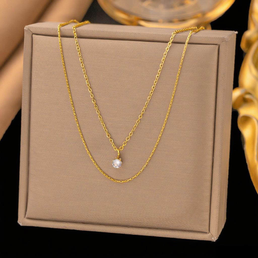 跨境新款闪钻吊坠双层钛钢项链女简约颈链小巧设计镀18K金锁骨链