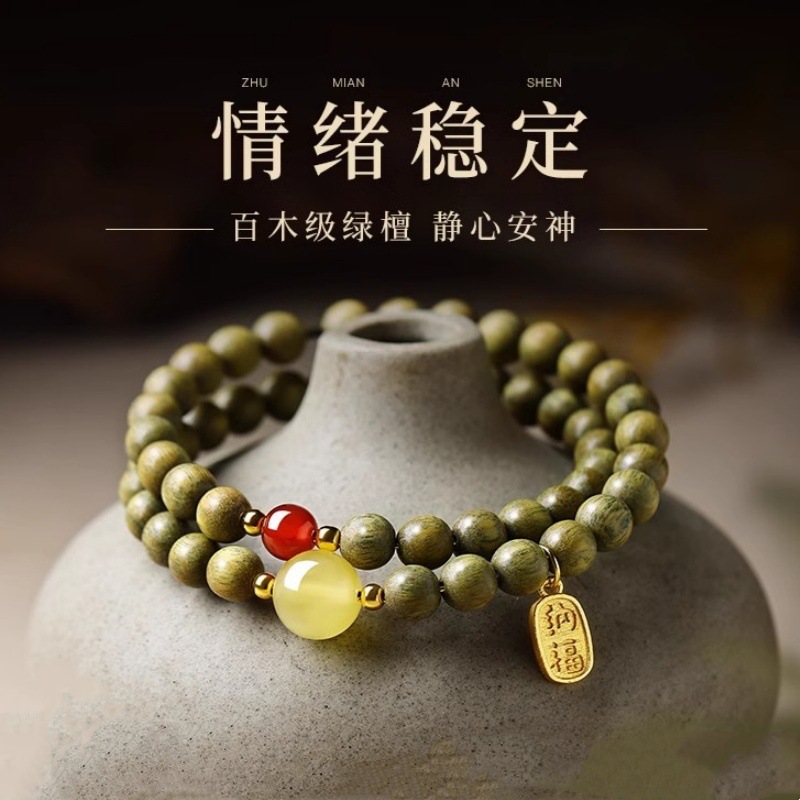 绿檀木双圈手串男女款檀香木质佛珠二代蜜蜡南红复古文玩手链礼物