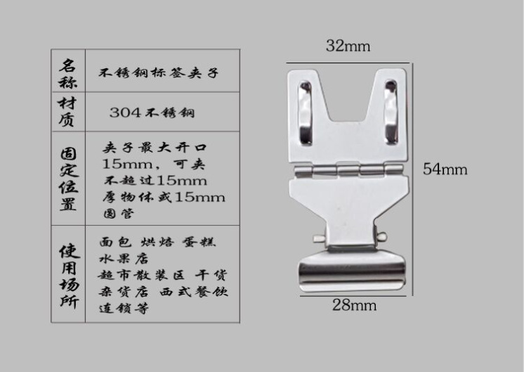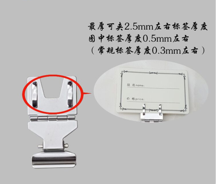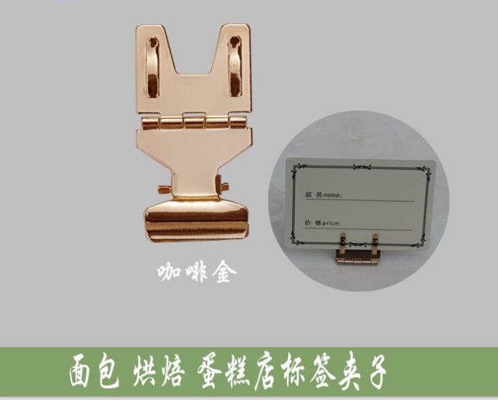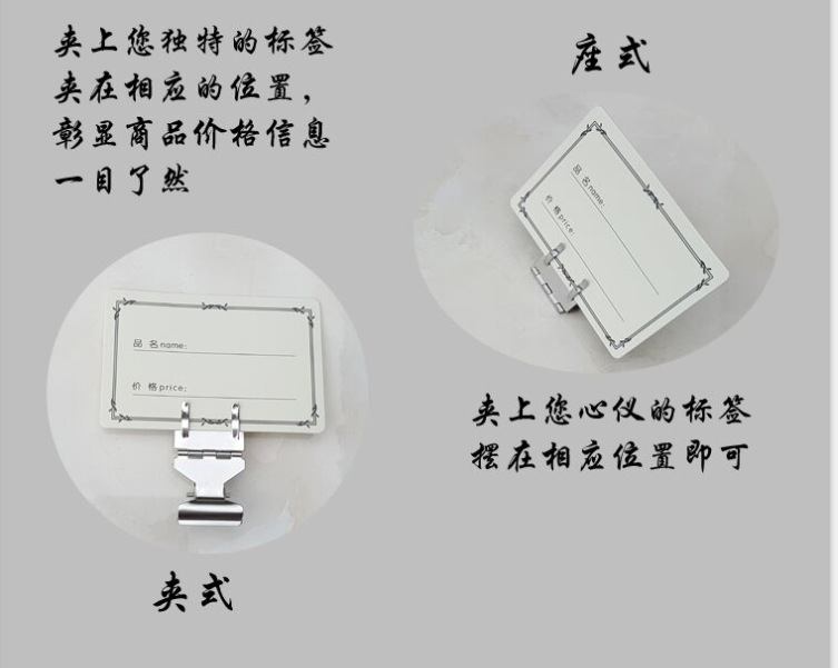 此款异形展示夹,小巧,使用不占空间方式简单,可座式,夹式。卡口处夹价签纸,夹口处可夹于面包托盘,商品散装柜边沿,咬合力强,不易掉落,可270度调式角度。是您不错的选择!!