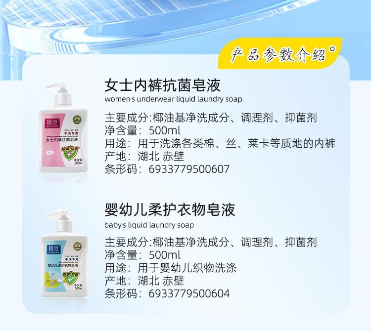 碧澄女士内裤内衣抗菌皂液婴幼儿椰油去污衣物除螨抑菌手洗洗衣液