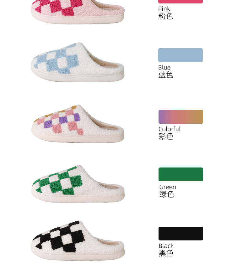 彩虹棋盘格子冬季室内防滑居家棉拖鞋毛绒保暖日常休闲毛毛拖鞋