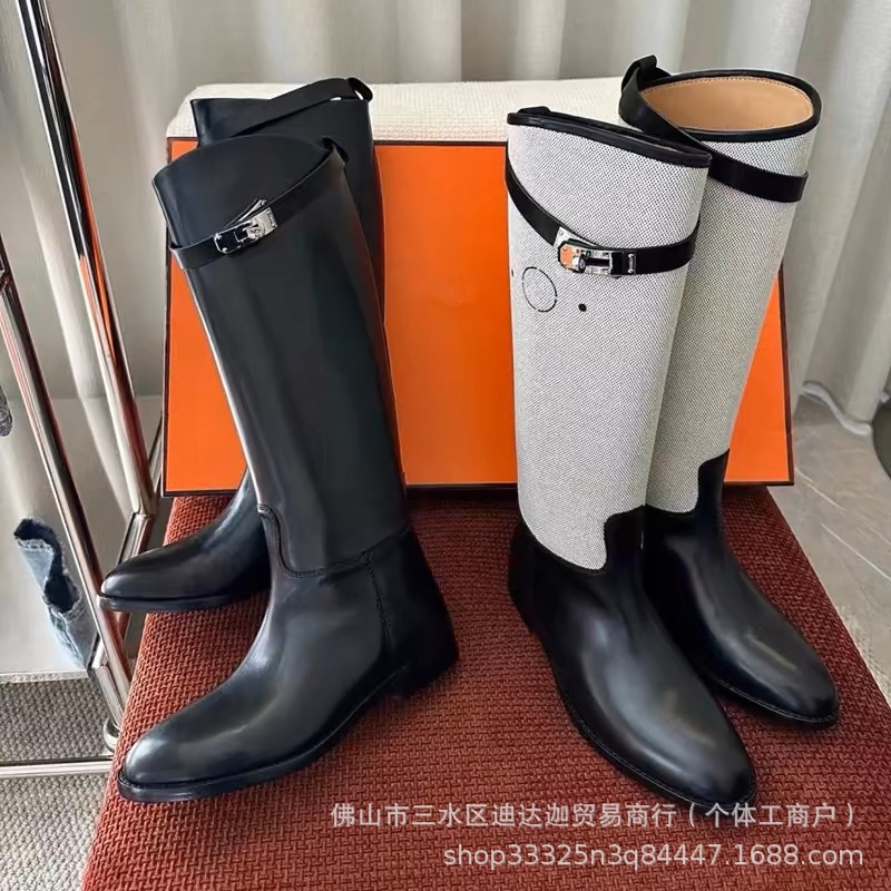 hh家真皮斜口锁扣英伦风不过膝骑士靴单靴粗腿长筒高筒皮靴长靴女