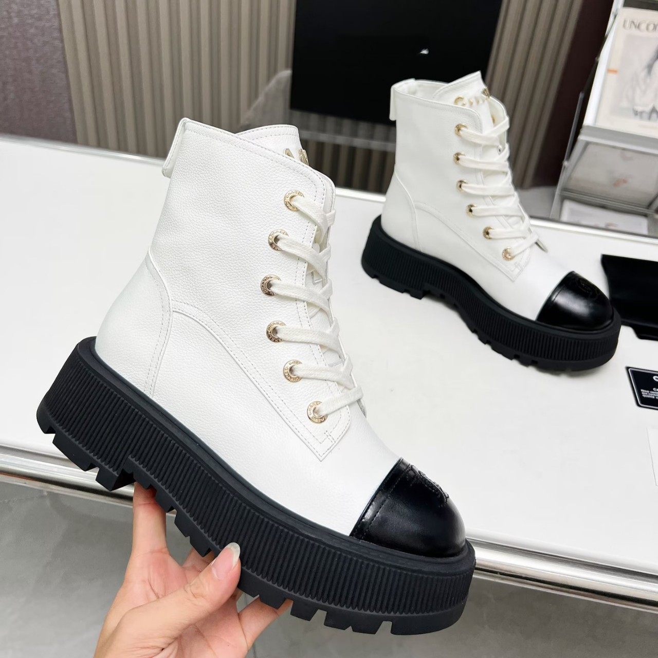 2025秋冬新款小香风荔枝纹厚底短靴女金属字母系带时尚百搭马丁靴