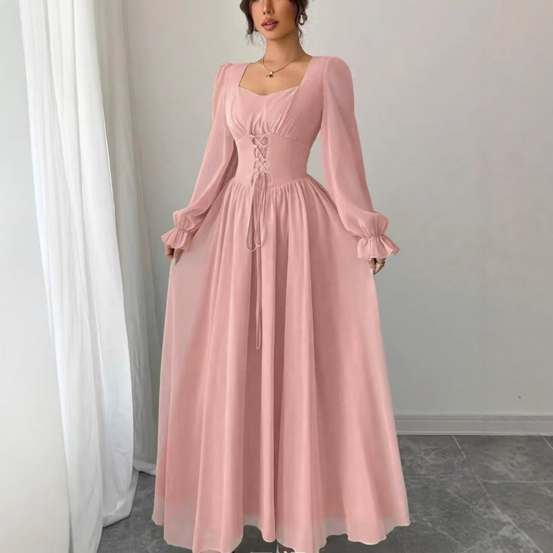 2025新款亚马逊跨境外贸欧美时尚女装收腰长袖抽绳褶皱法式连衣裙