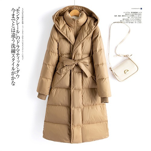 厚みのある膝丈ミドル丈フード付きダウンジャケット レディース ベージュ カーキ ブラック ホワイト ダックダウン ダウンジャケット HZ0557