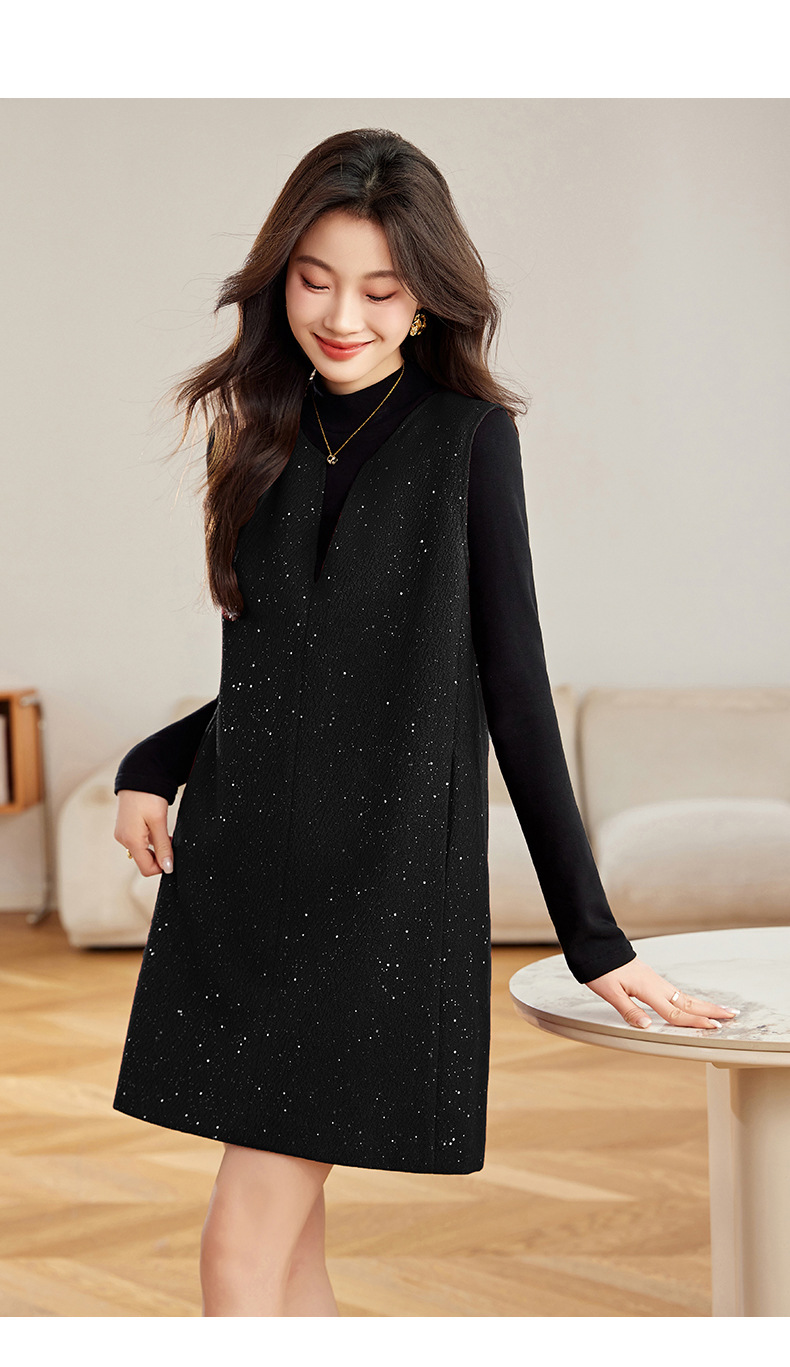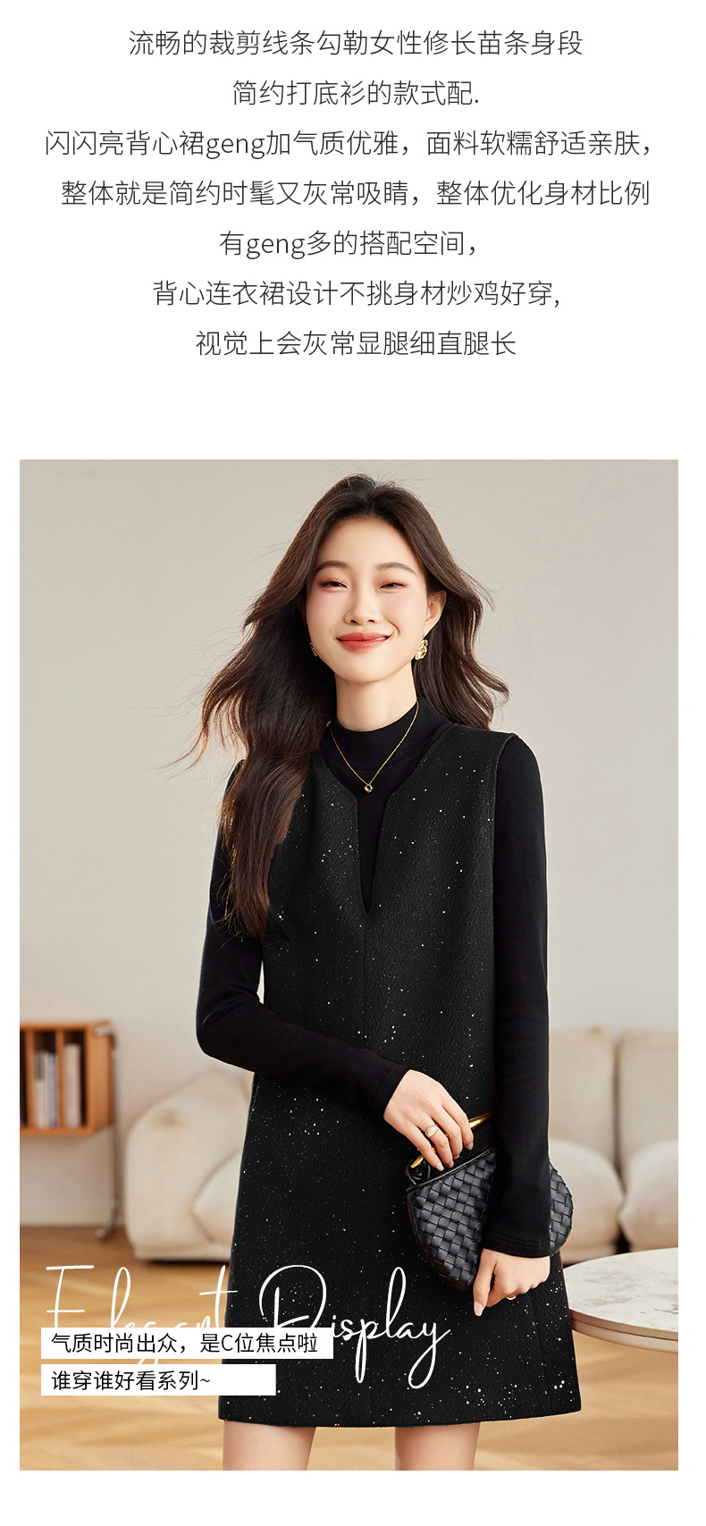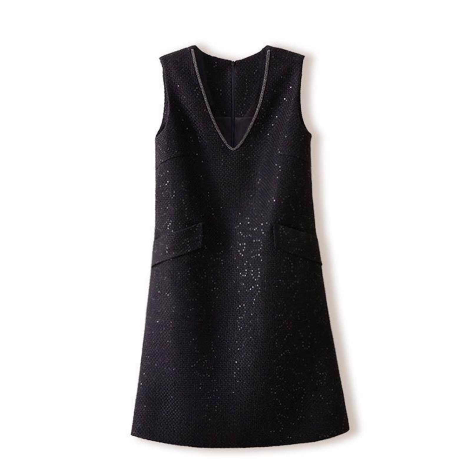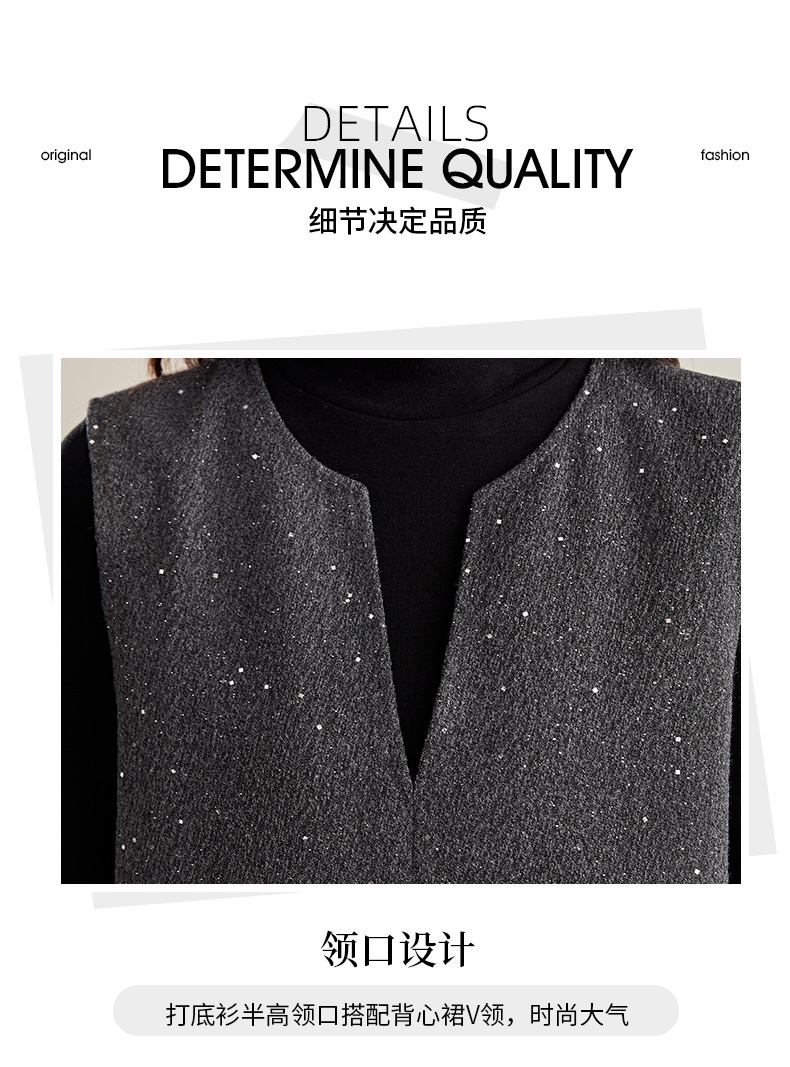 法式小香风毛呢黑色亮片背心裙女秋冬季新款V领高级感外搭马甲裙